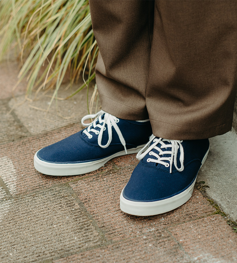 60年代に展開されていたデッキシューズを復刻した〈Keds〉とのコラボスニーカー。本と猫の刺繍が施された私物のキャップと同じネイビーで色合わせ。
