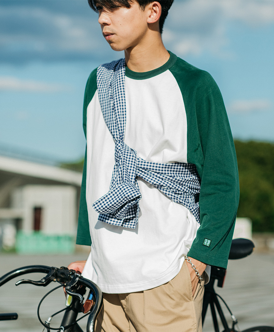 ドレスシャツにも使用されるイタリアの生地メーカー〈ALBINI〉の上質な生地をカジュアルなギンガムチェックに落とし込んだ一枚。リラックス感のあるラグランTシャツと合わせることで、よりスポーティな着こなしに。
