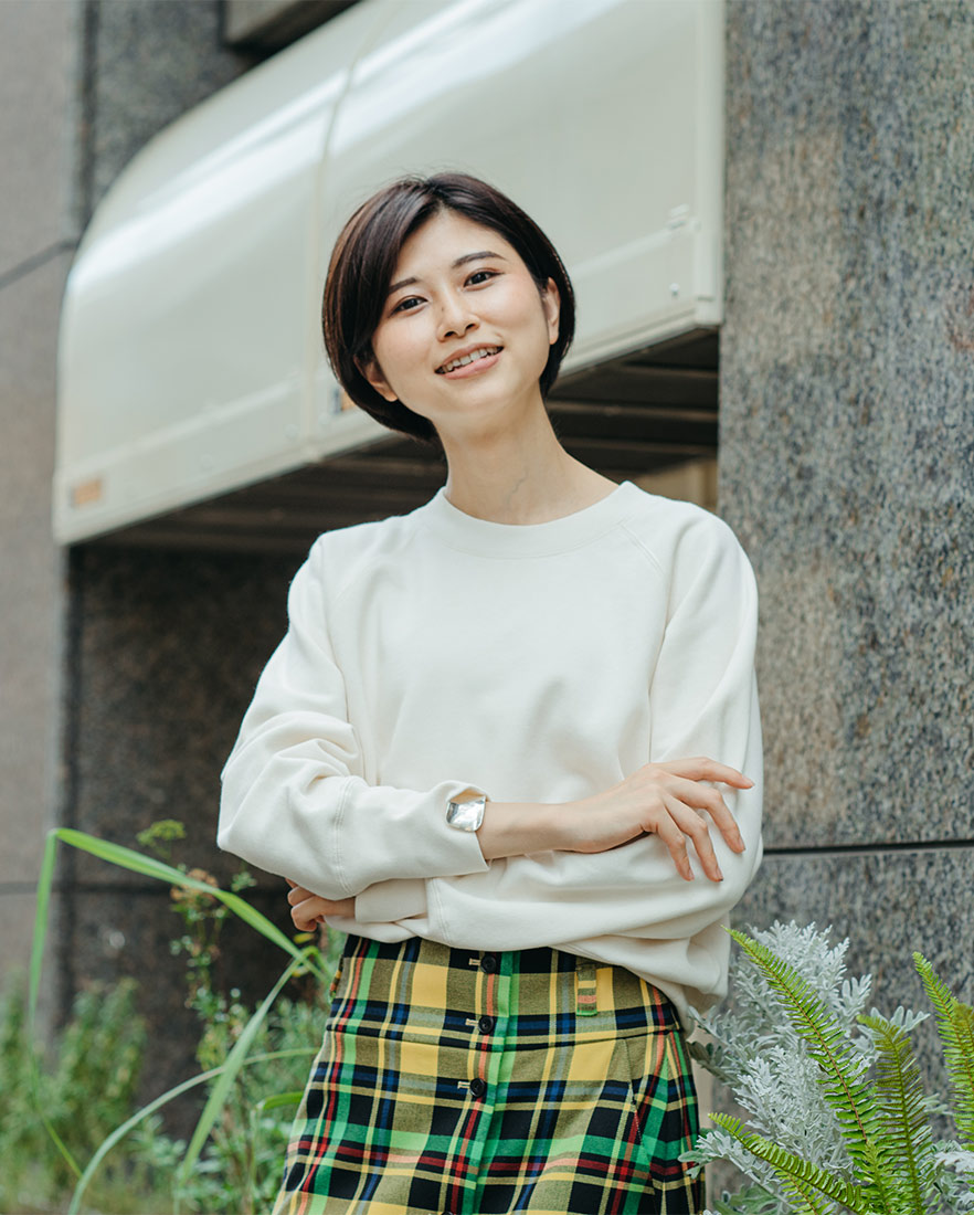 ビビッドカラーを投入 - 美味しいものが大好きで、よく食べ歩きに出かけるという松井さん。「仕事ではパンツスタイルが多いですが、休日に友達とご飯へ行く時はスカートやワンピースを着ることも。つい見慣れた色や柄を選びがちですが、定番から外れてみるのも楽しいですよね。今日着たチェックスカートも少し派手すぎるかな?と思うくらい、あえてビビッドな色味を選んでみました。派手めのものをひとつ合わせるくらいのバランス感が好きなので、シンプルなスウェットと、やわらかなオーガニックコットンのデニムジャケットを合わせました」。