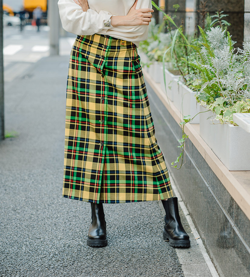 今季らしいビビッドなカラーリングのチェックスカートは、長めの丈感とラップ仕様のデザインが大人な雰囲気。「普段はもう少し落ち着いたトーンを選ぶのですが、このイエローが気になって。黒が入っていてシックな雰囲気なので着こなしやすいですね」と松井さん。フロントの裾部分はスリット入りで足捌きも◎