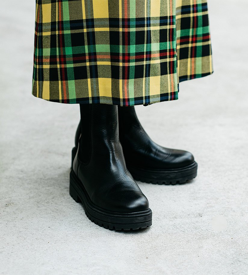 タータンチェックのスカートとも相性抜群。コーディネートをきりっと引き締めてくれるスペインのシューズブランド〈VINILO〉の別注チェルシーブーツ。やわらかな履き口とトレンドの厚めのソールが魅力。