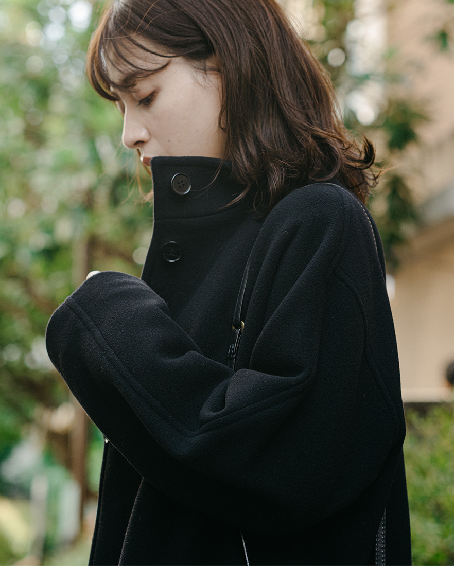 トラッドな雰囲気のスタンドカラーのロングコート。SUPER100(繊維の細さを示す数値で高いほど細く上質とされる)の良質なウール生地にビーバー加工を施すことで、ふっくらとした滑らかな肌触りに。袖はリラックス感漂うドルマンスリーブで、フェミニンさもあわせ持ったデザイン。