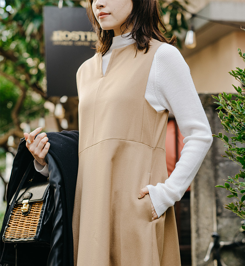 シーズンを問わず、ワンピースをよく着るという前坂さん。ゆるやかなフレアシルエットのジャンパースカートは、ウエスト部分の切り返しが高めにつくられている分、スタイルアップ効果も。薄手のタートルネックにキーネックのデザインが映えて、顔周りをすっきりと見せてくれます。