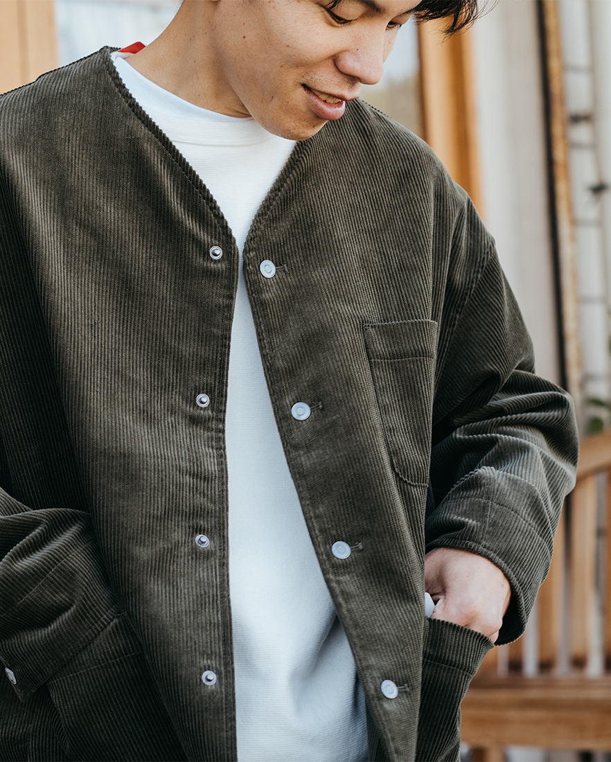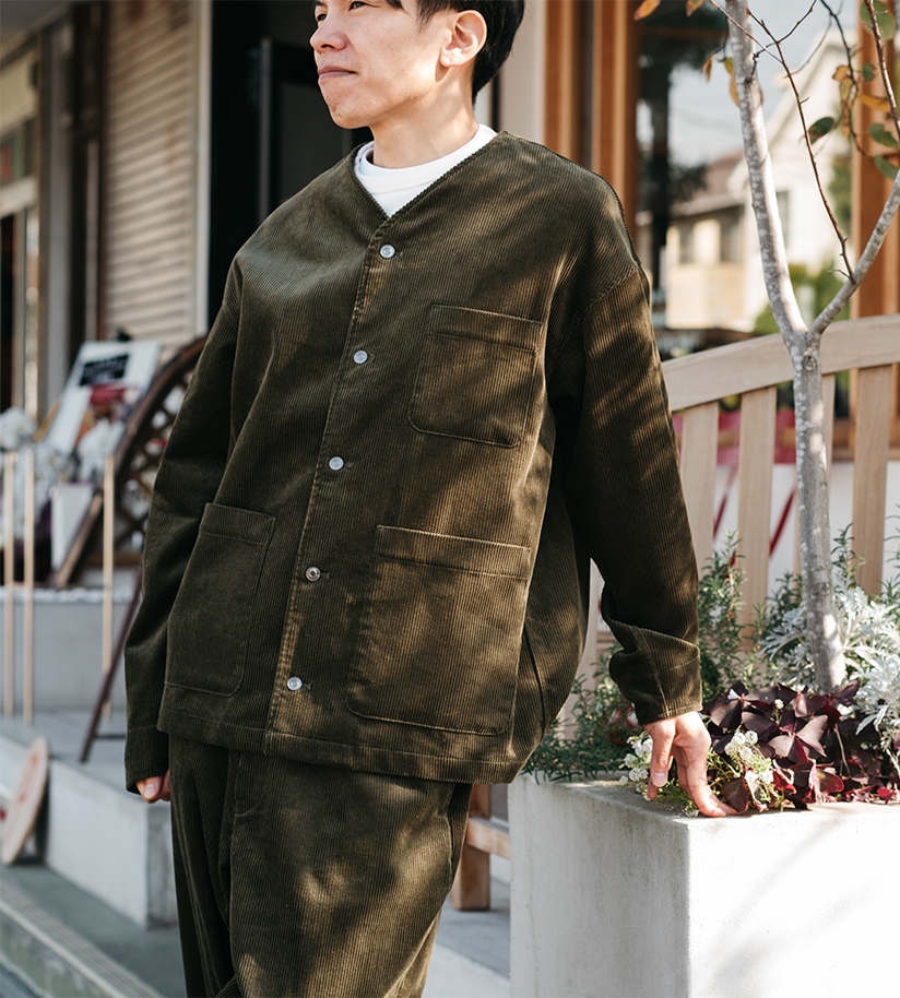 ノーカラーのアイテムが普段から大好きだという立道さんが選んだのは、ヴィンテージライクな風合いに仕上げたコーデュロイのセットアップ。季節感のある暖かい素材は、冬の寒い日でもしっかりと活躍してくれます。