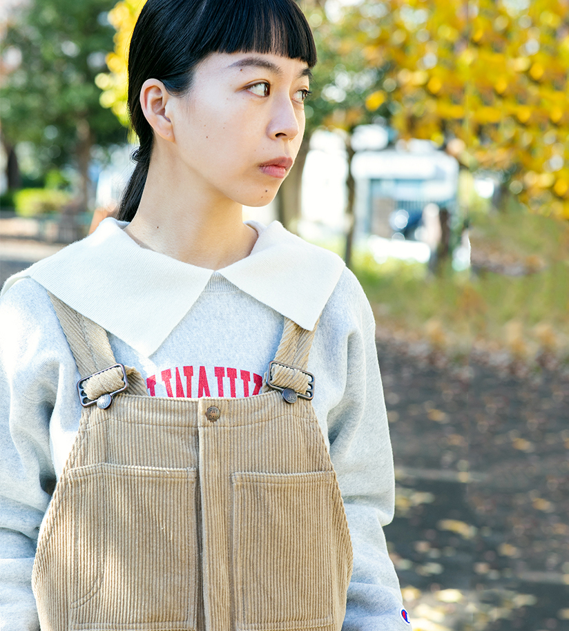 セレクト時には真っ先に手に取った、大きなカラーがポイントのセーラーニット。スウェットとオールインワンを重ねたkikaさんらしいスタイリング。