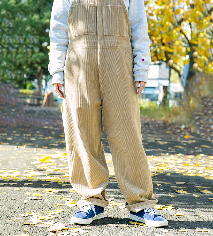 ゆったりとしたシルエットが特徴のオールインワンは、忙しい現場での動きに欠かせないアイテム。しっかりとした厚めのコーデュロイの生地で、冬の屋外でも快適に過ごせそう。