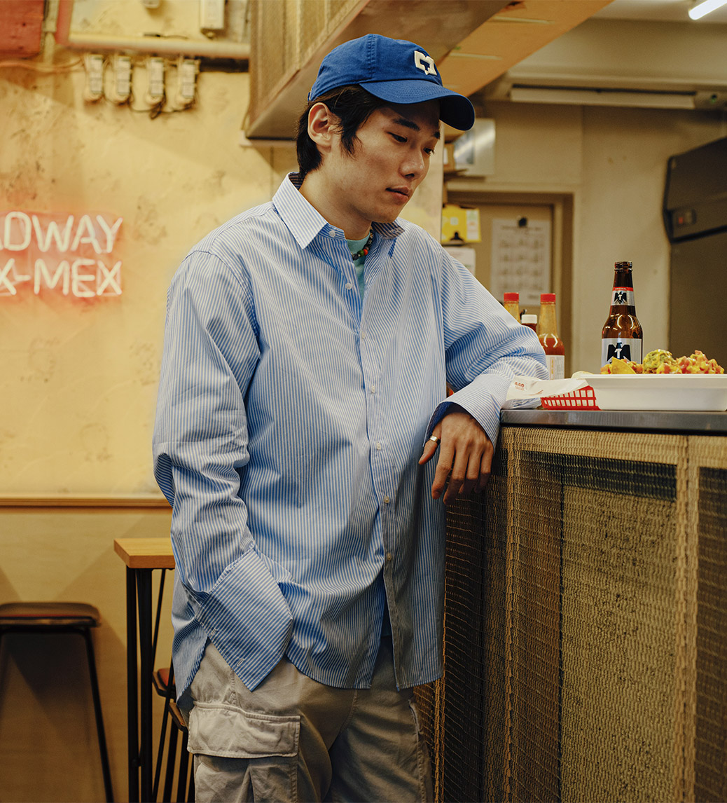 - メキシカンには爽やかな色のシャツを着たいと思って、まずこのシャツを選びました。色は青を軸に、そこへカーゴパンツでワークテイストを混ぜたのがポイントです。キャップは実は事務所のオリジナルグッズなんです。