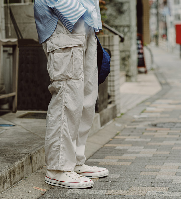ウエスト部分が平ゴムと紐で調整可能な、イージーパンツ仕様のカーゴパンツ。「シルエットは真っ直ぐ綺麗なのに、ゆったりとしていて履き心地も良いですね。カーゴパンツは楽にはけてシワになりにくいので普段から重宝しています」