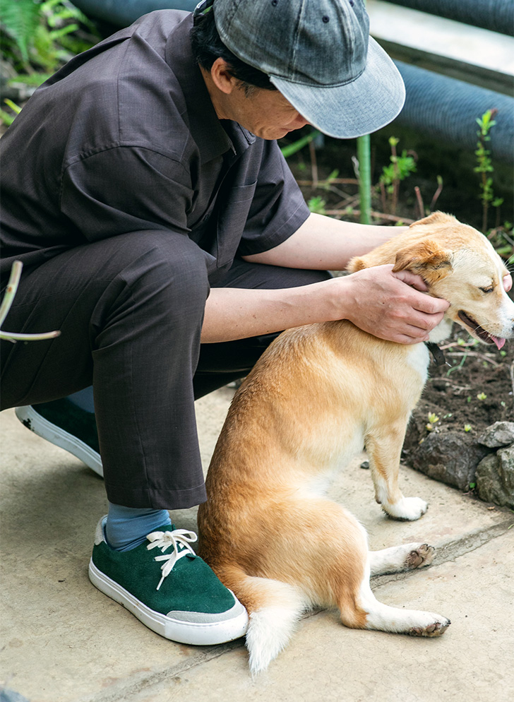 江口さん愛用の〈TOUN〉のスニーカーは友人でグラフィックデザイナーの山野英之さんがデザインしたもの。こっくり深みのあるグリーンが、セットアップの落ち着いた雰囲気ともよく合います。ちなみに、お隣にいるのは〈mitosaya〉の看板犬・むぎちゃん。