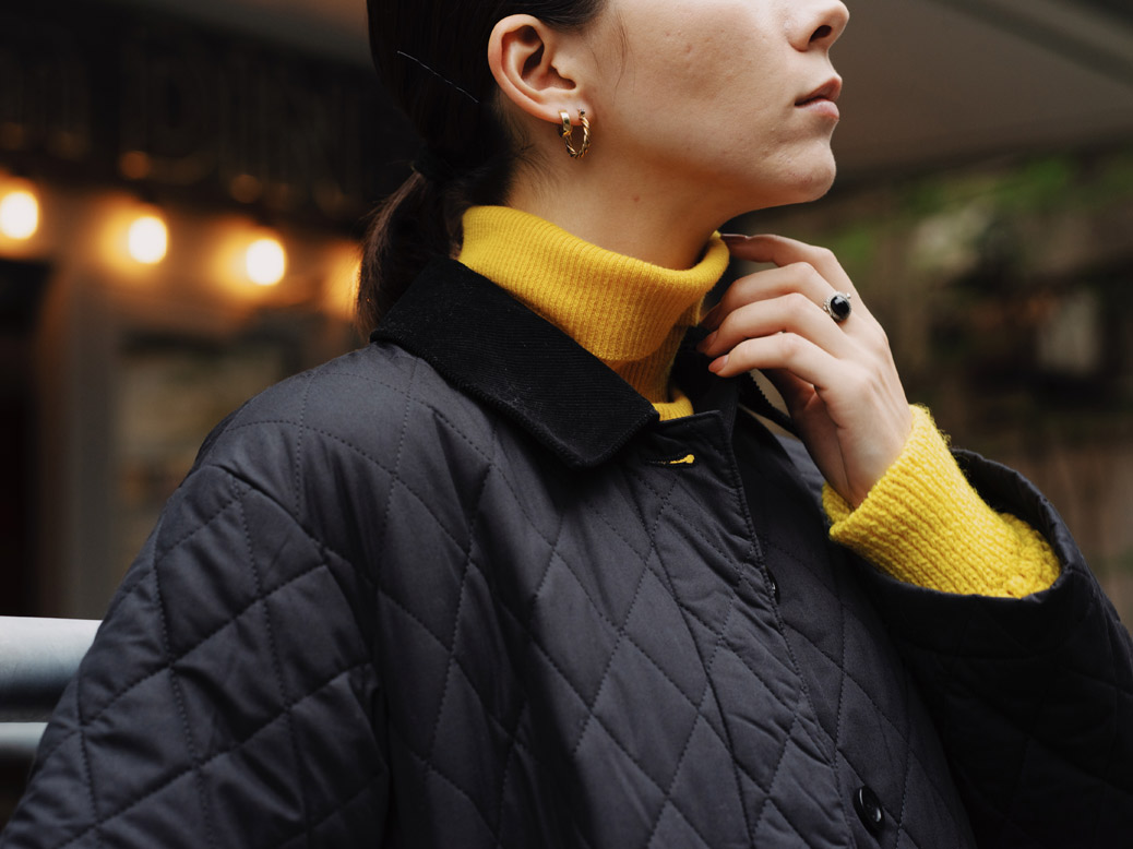 トラッドな雰囲気の漂うキルティングコートは、襟元のコーデュロイ使いとゆとりのあるシルエットがポイント。イエローとのコントラストもよく映えます。