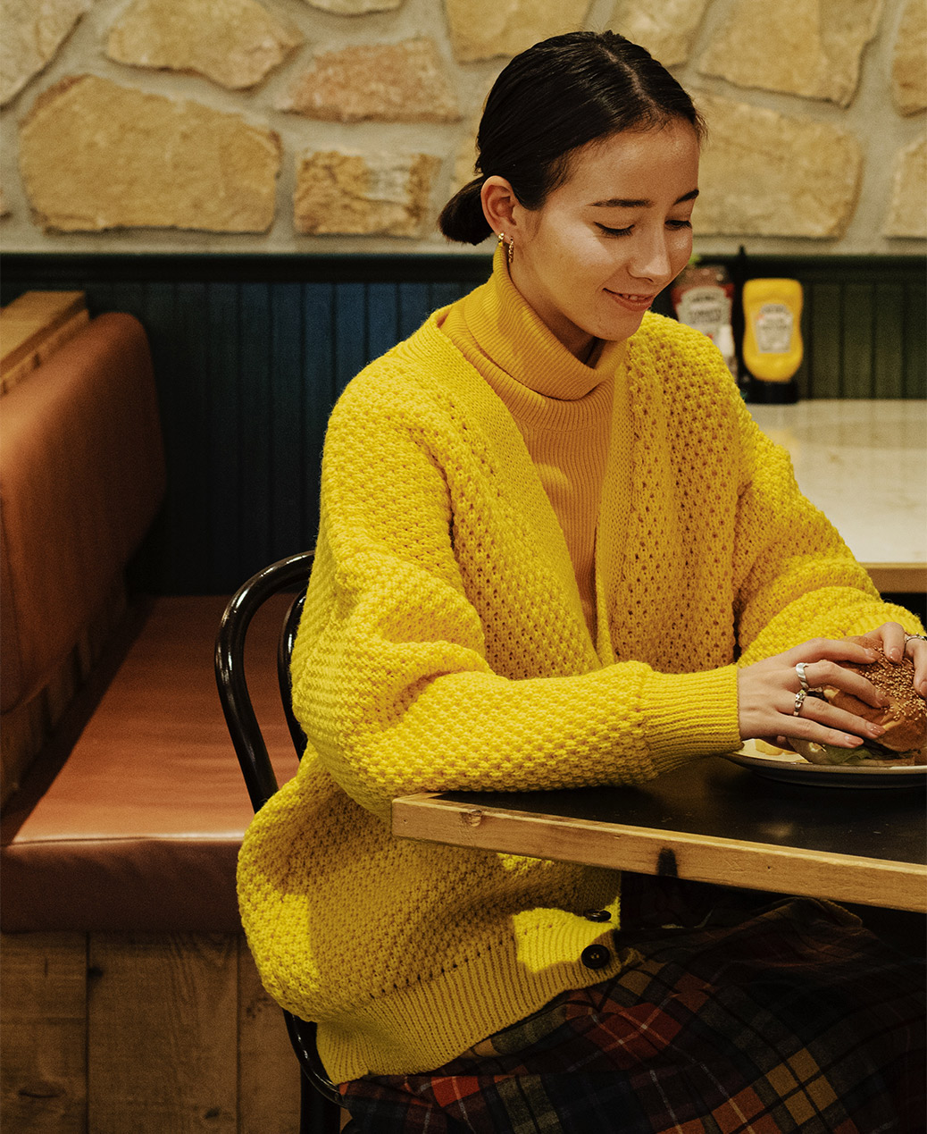 オーバーサイズでゆったり羽織れる〈Oldderby Knitwear〉のカーディガン。「明るい発色とボリューム感、目のつまった暖かな生地感も好きです」と理紗さん。