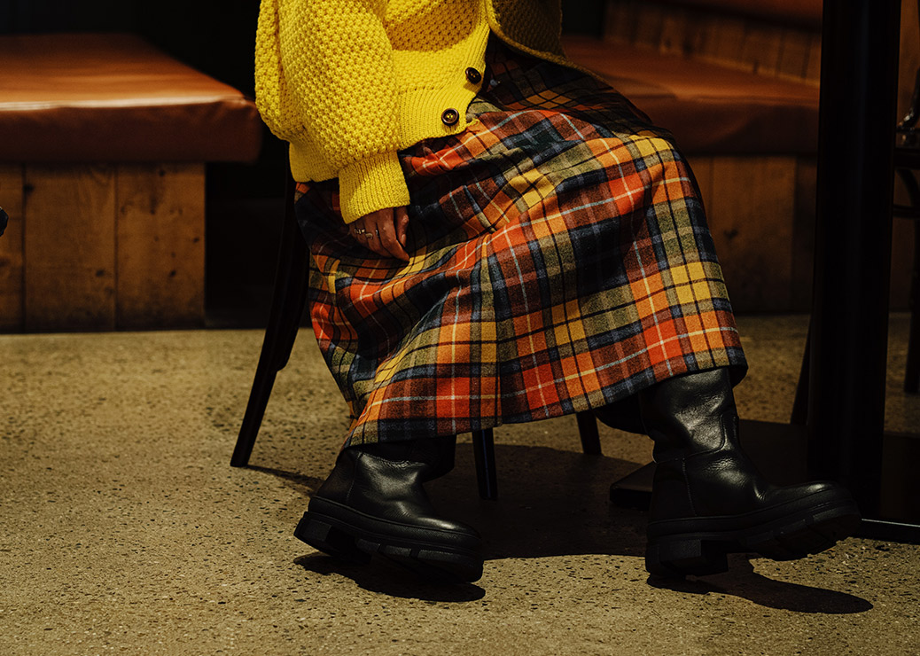 鮮やかなオレンジのチェック柄と、裾にかけてゆるやかに広がるシルエットが魅力のプリーツスカート。足元には黒のロングブーツを合わせて、甘すぎないトラッドな着こなしに。