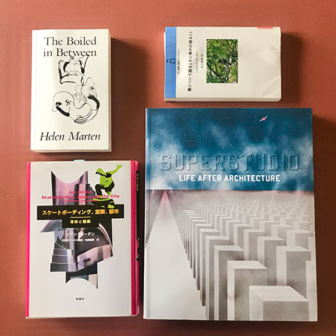 橋さんが敬愛する、建築、アーティスト、大切な家族。左)最近ヨーロッパを旅した橋さん。「ル・コルビュジエが設計したサヴォア邸は、まさに近代建築の金字塔。いろんな空間があって、シェアハウスしたらきっと楽しいと思います」左中)ケルン郊外に佇むブラザー・クラウス野外礼拝堂。「地元の農家の方に依頼されピーター・ズントーが建てた教会。建つまでのプロセスも面白いです」右中)妹の佳子さんの誕生日祝い。「佳子は尊敬すべき人。思いやりがあって、人間をよく知っている」右)橋さんの愛読書。「大好きなアーティスト、ヘレン・マーティンが描いた小説と、カーヴァーの短編集は寝る前や撮影の合間に。建築家集団・スーパースタジオの展覧会図録と、イアン・ボーデンの建築批評は、スケートボーダーの視点から建築や都市を捉え直していて新鮮です」