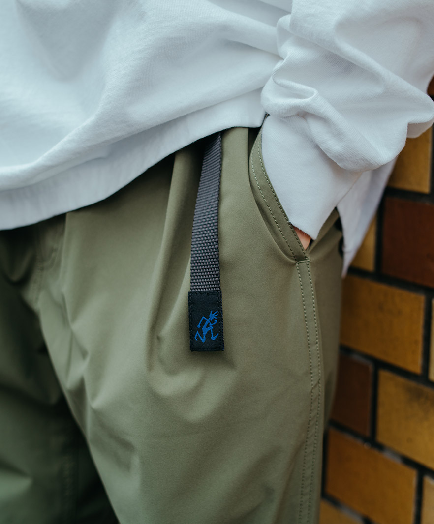 アウトドアブランド〈GRAMICCI〉と〈SHIPS any〉のコラボレーションパンツ。ストレッチが効いた動きやすい素材なうえ、きれいなシルエットでカジュアルすぎないので様々なシーンで活躍します。コードベルトでウエストを調節できるのも便利。