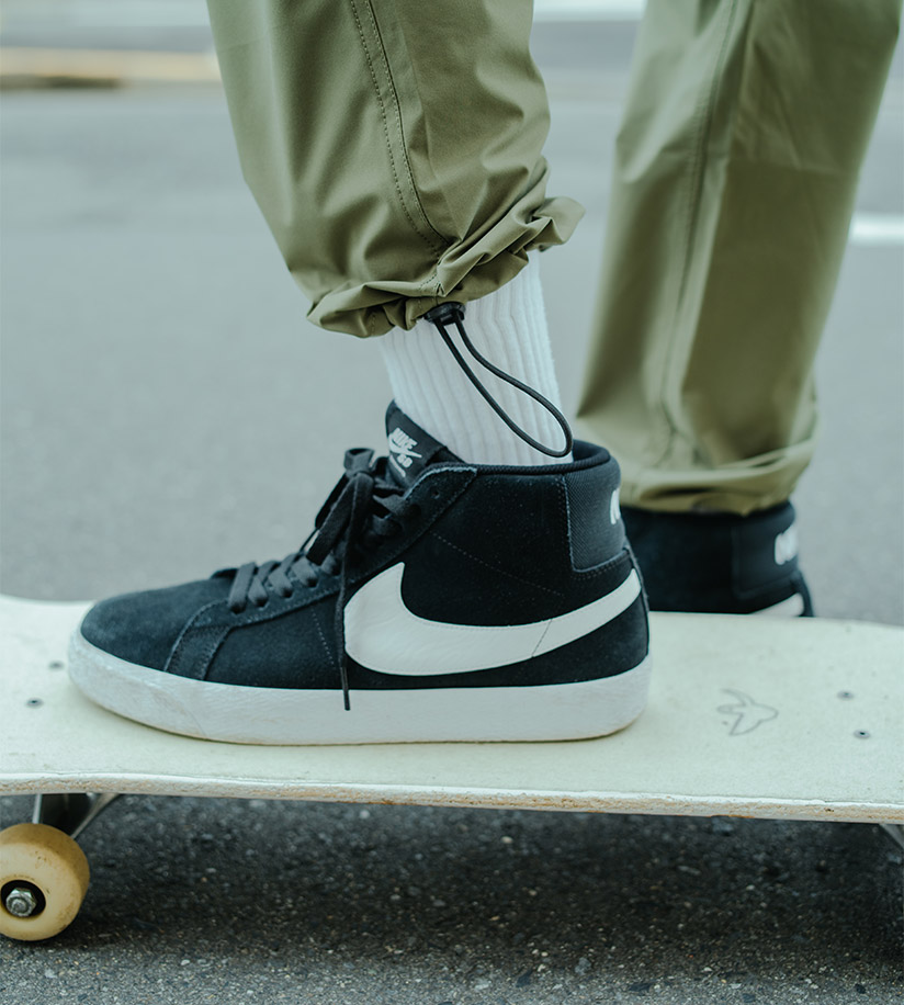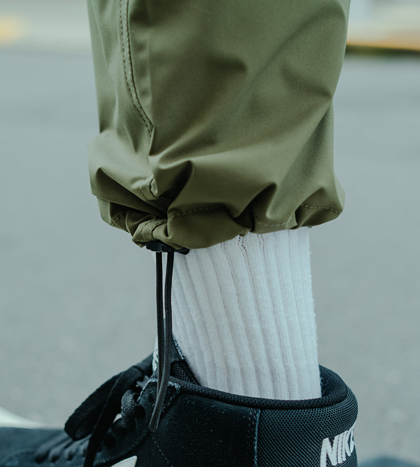 裾部分にはドローコードが付いていて、機能性に加えてシルエットの変化も楽しめます。「スケボーに乗るときに絞れるのでちょうど良いです」と、はるかくん。
