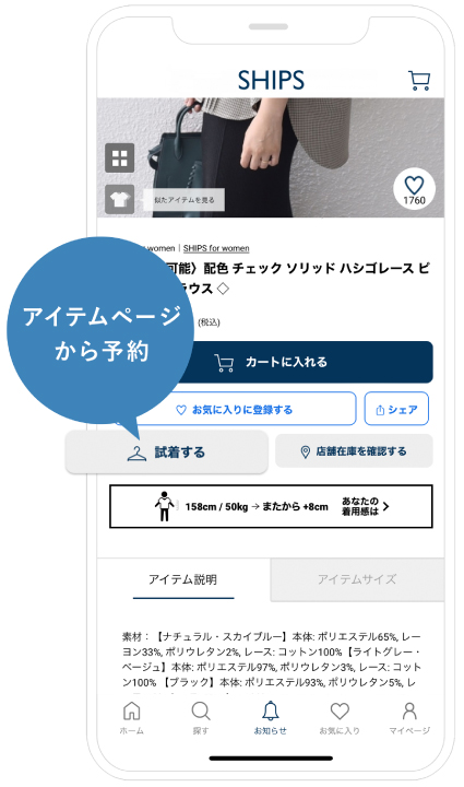 バーコード機能では、商品タグのQRコードをスキャンするだけで、お手元のスマホで詳しい商品情報を見ることができます。