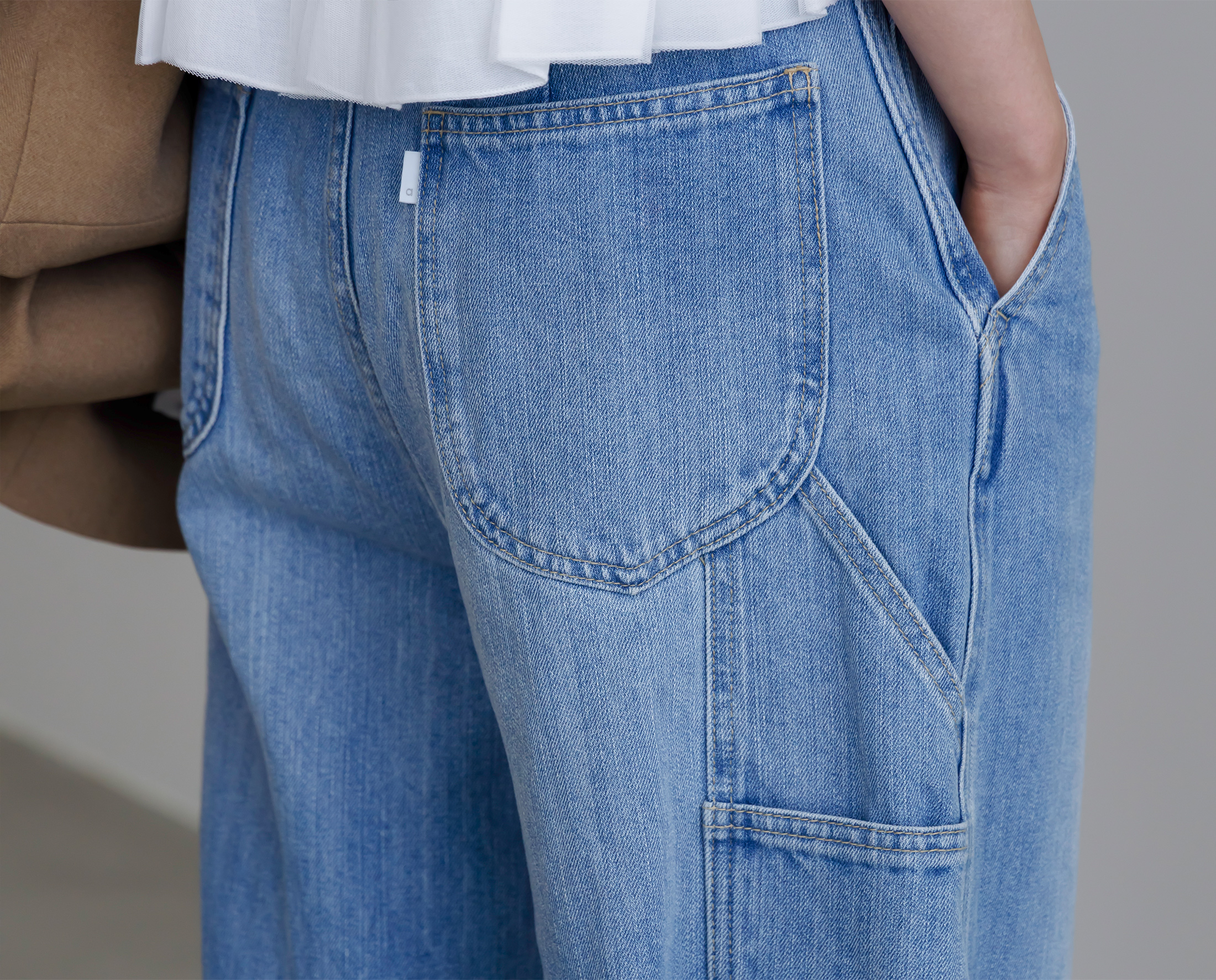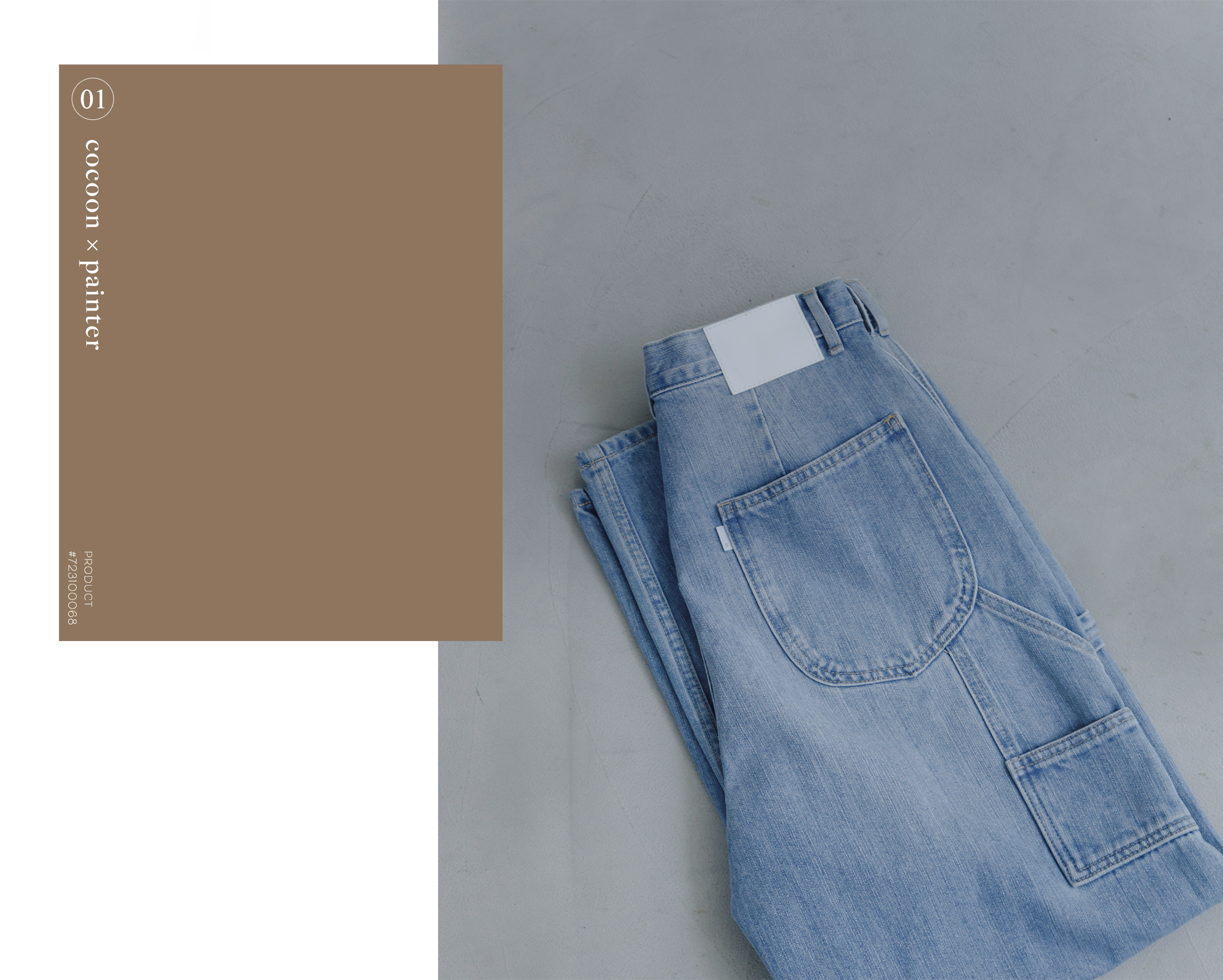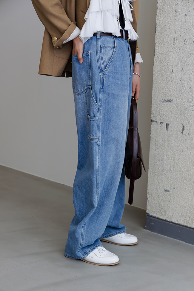 センスのいい人たちがこぞって取り入れている、立体感のあるカーブラインが特徴的なデニム。ペインターパンツのディテールを取り入れることで、のっぺりした印象にならず取り入れやすいんです。膝裏や腰まわりにタックを入れることで、ゆるいシルエットはそのままスッキリと仕上がるのもポイント。さわやかなライトブルーは晩夏から活躍してくれそう!