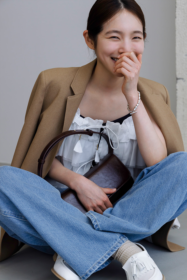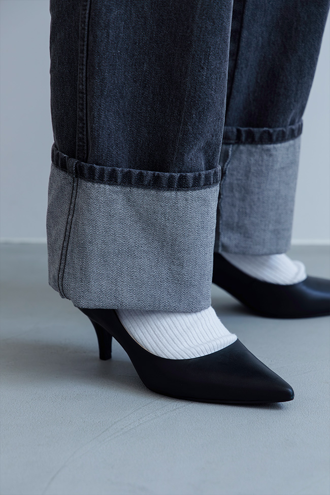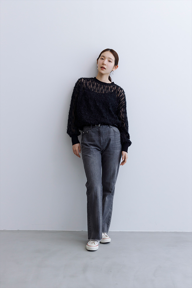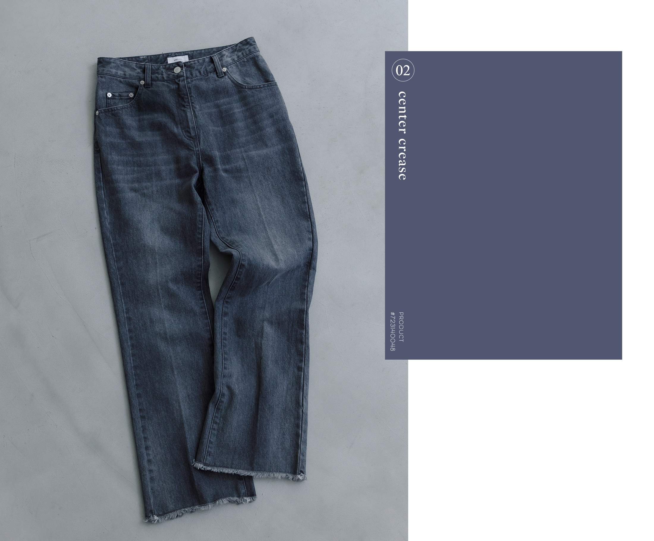 いわゆる「美脚デニム」にありがちな前のめり感はないのに、自然とスタイルよく見える塩梅が素晴らしい1本。膝位置を高く設定したり、センタープレスや色落ちの入れ方など細部にこだわっていて穿く人を選びません。裾を切りっぱなしにすることで、ラフな雰囲気も漂います。秋らしくニットとの合わせでも、ウエストにインして脚長ラインを際立たせて。