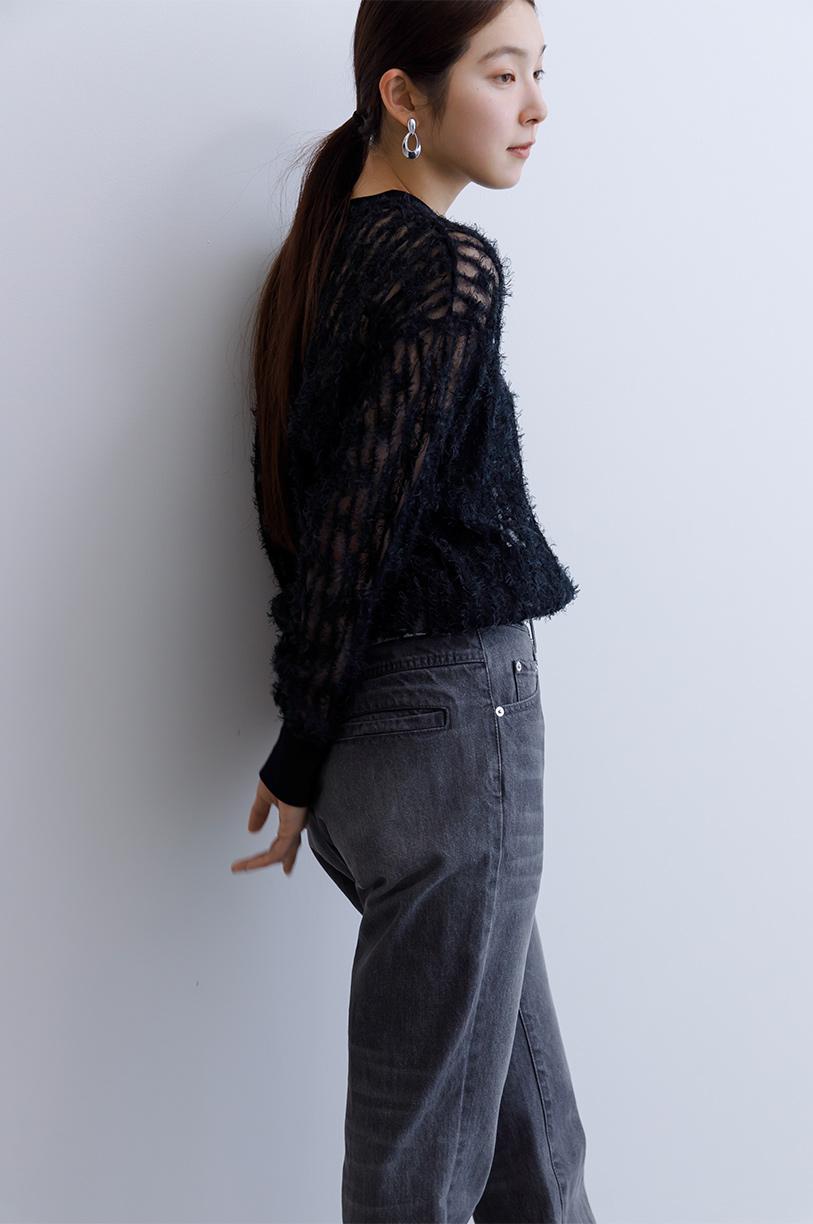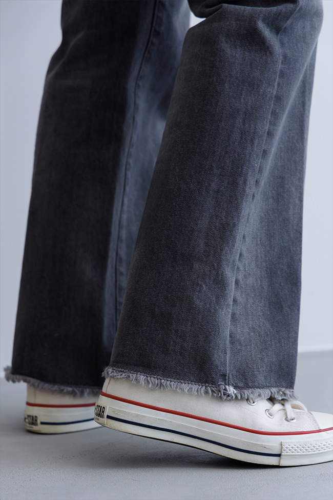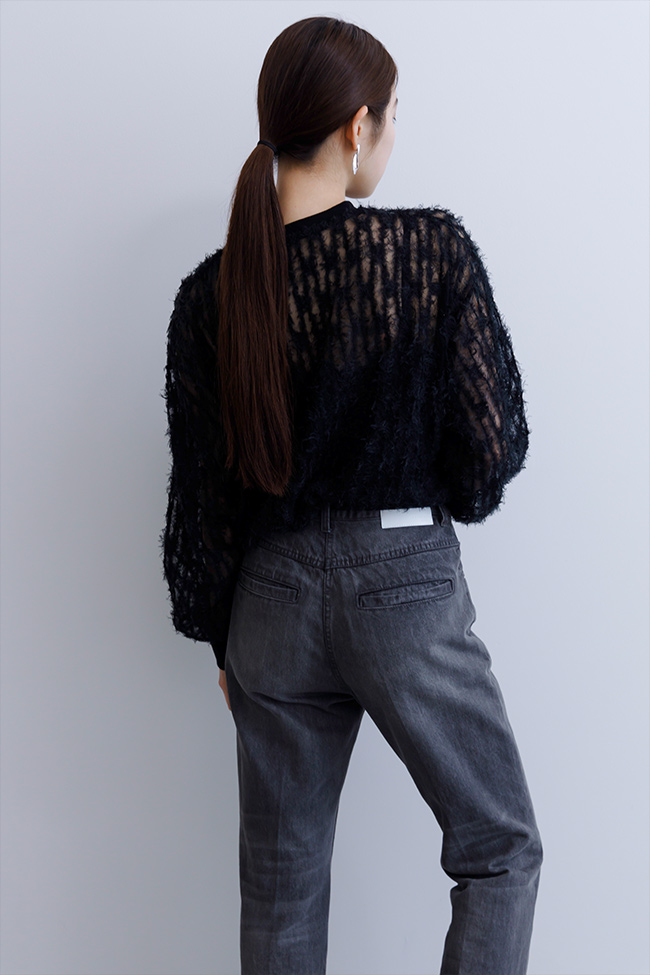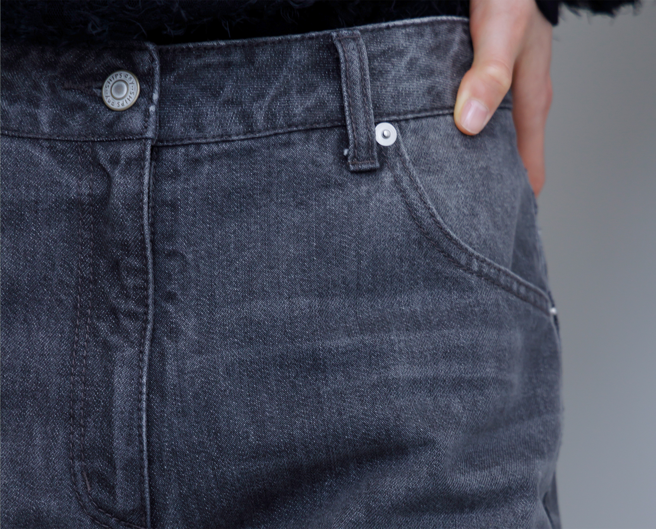 いわゆる「美脚デニム」にありがちな前のめり感はないのに、自然とスタイルよく見える塩梅が素晴らしい1本。膝位置を高く設定したり、センタープレスや色落ちの入れ方など細部にこだわっていて穿く人を選びません。裾を切りっぱなしにすることで、ラフな雰囲気も漂います。秋らしくニットとの合わせでも、ウエストにインして脚長ラインを際立たせて。