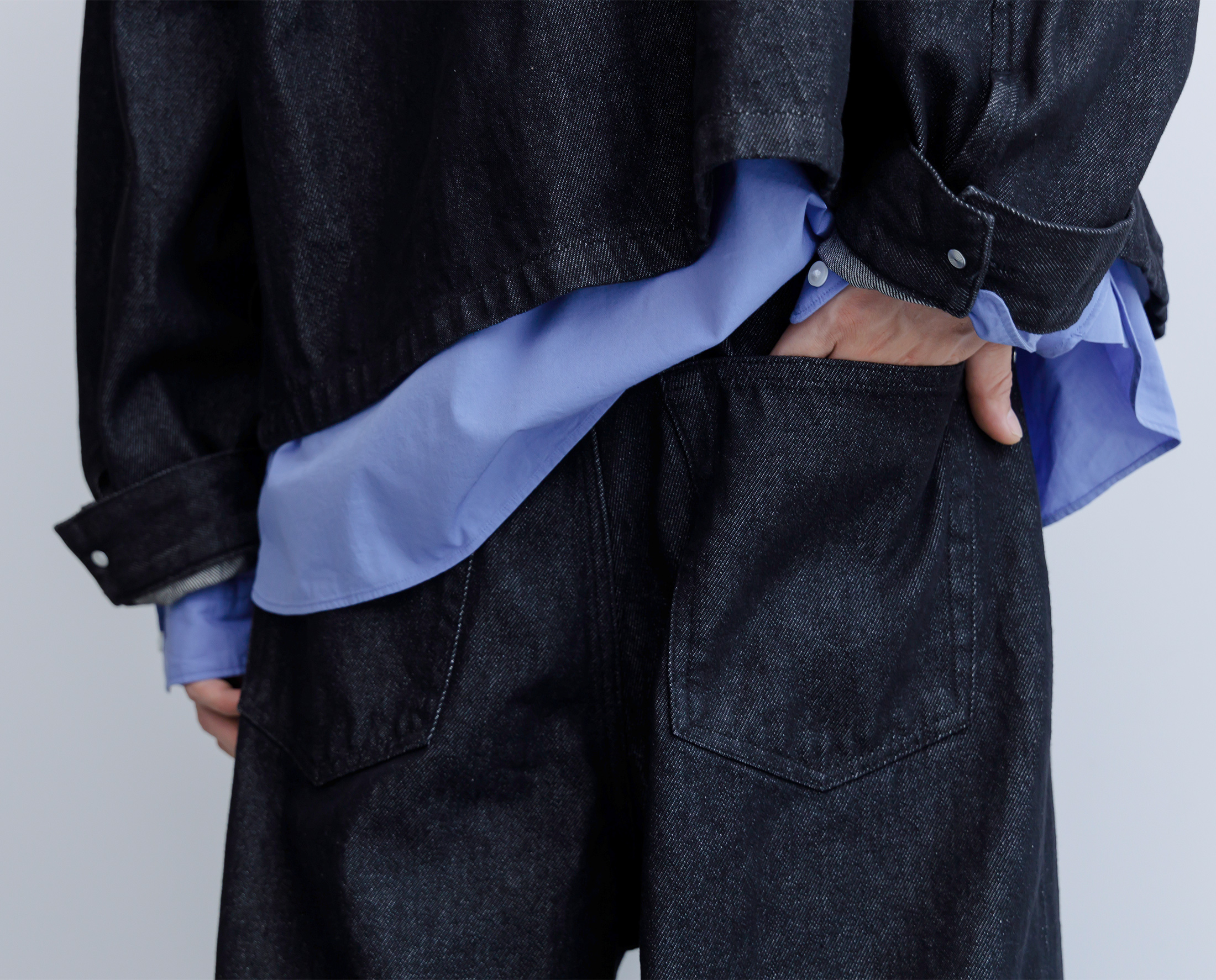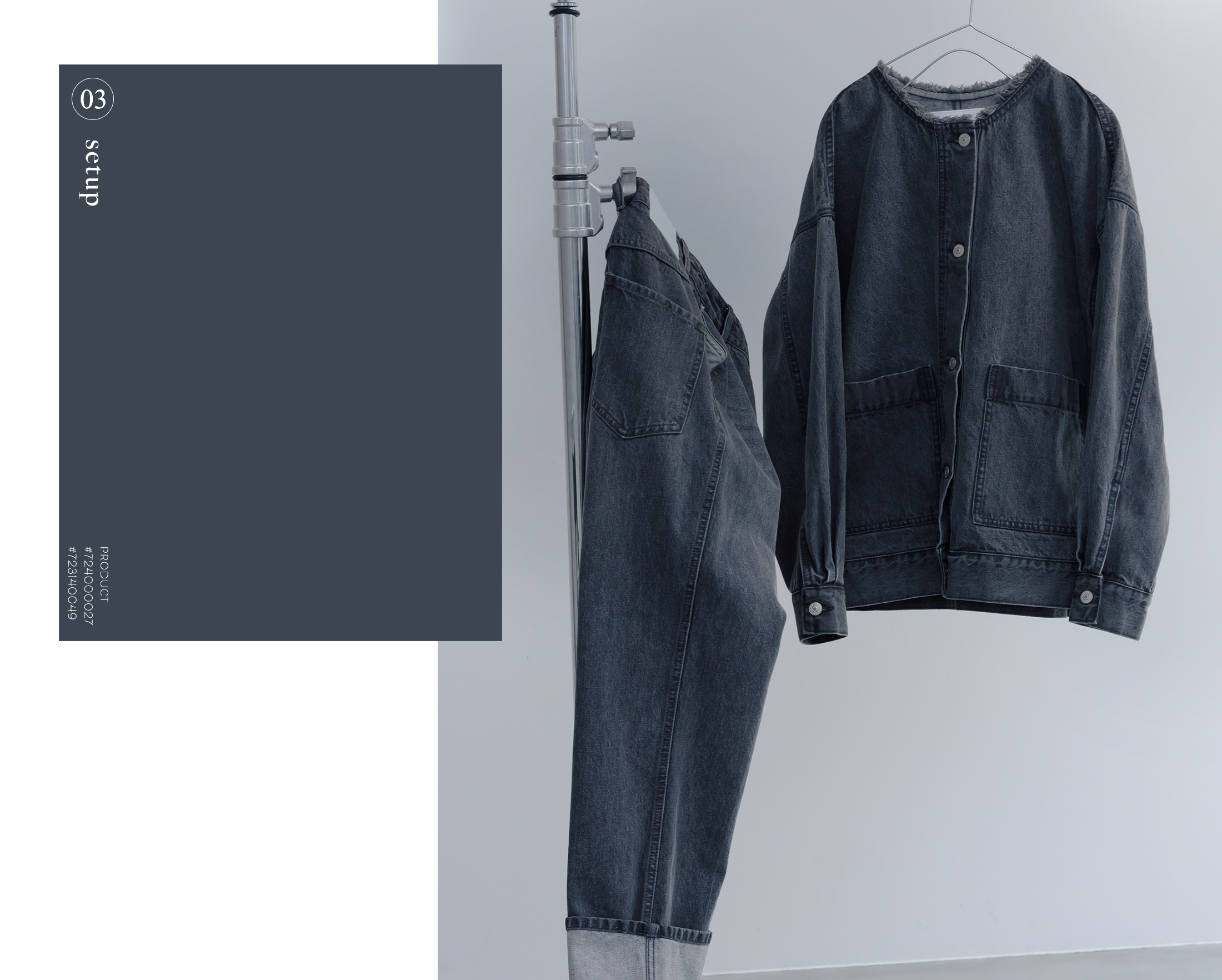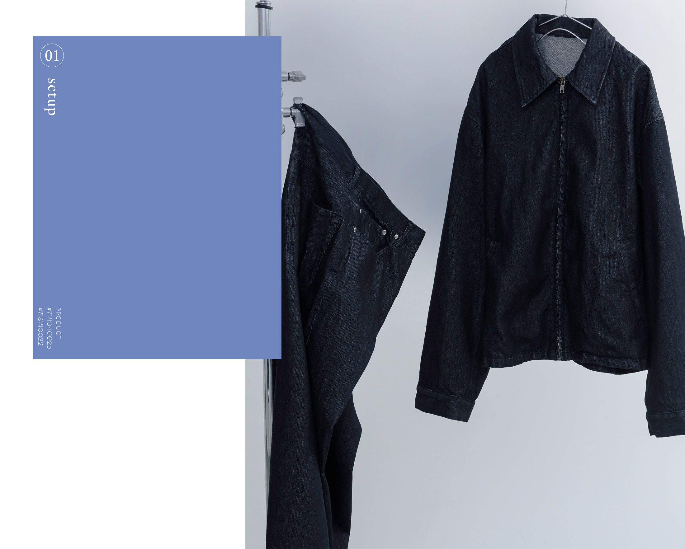 あえて手の甲が出ないように長めに設定した袖丈や通常よりひとまわりほど大きい襟にこだわったブルゾン。そこにややフレアになったワイドパンツの組み合わせでゆるいこなれ感が生まれます。大人がクリーンに着られるように、12オンスのワンウォッシュデニムを採用。合わせるだけでセンスアップするセットアップが完成しました。