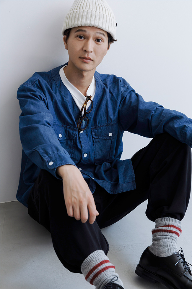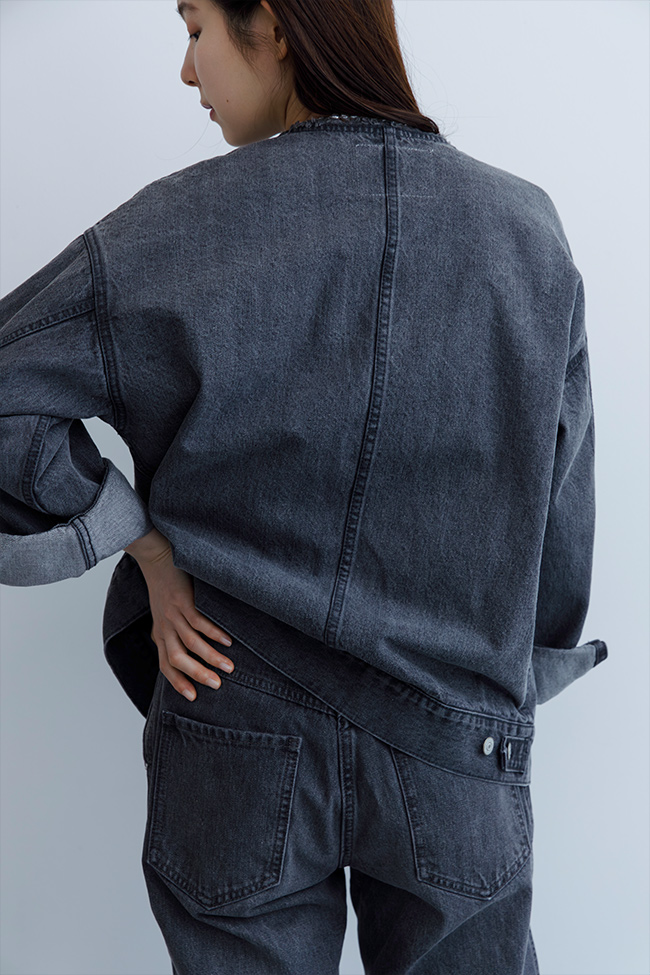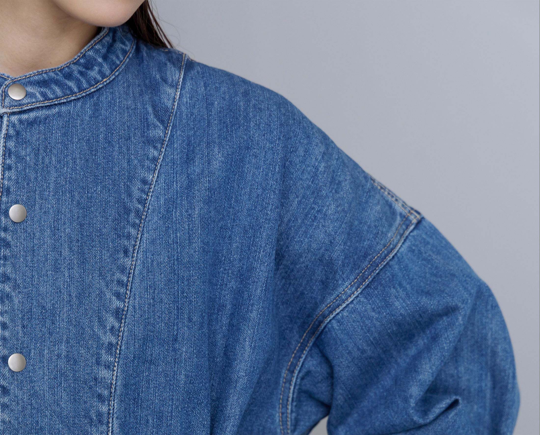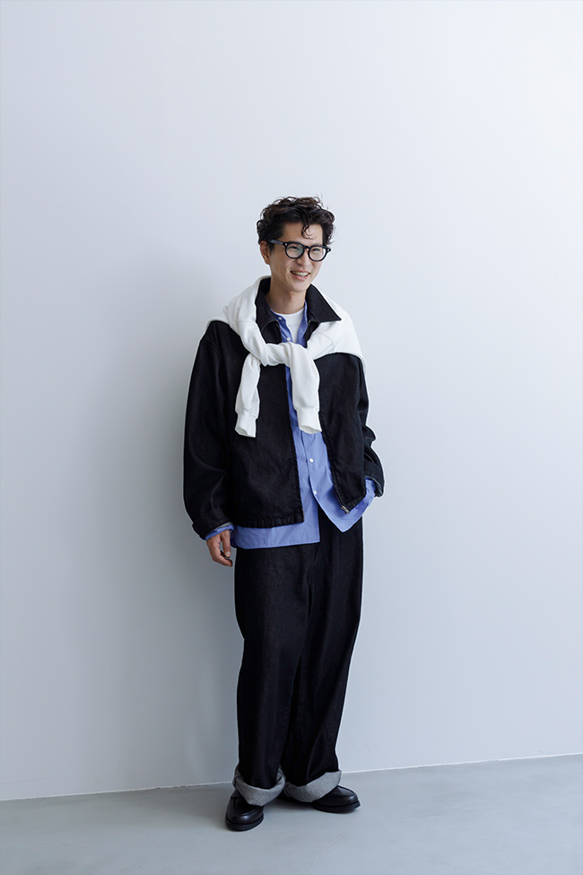 あえて手の甲が出ないように長めに設定した袖丈や通常よりひとまわりほど大きい襟にこだわったブルゾン。そこにややフレアになったワイドパンツの組み合わせでゆるいこなれ感が生まれます。大人がクリーンに着られるように、12オンスのワンウォッシュデニムを採用。合わせるだけでセンスアップするセットアップが完成しました。