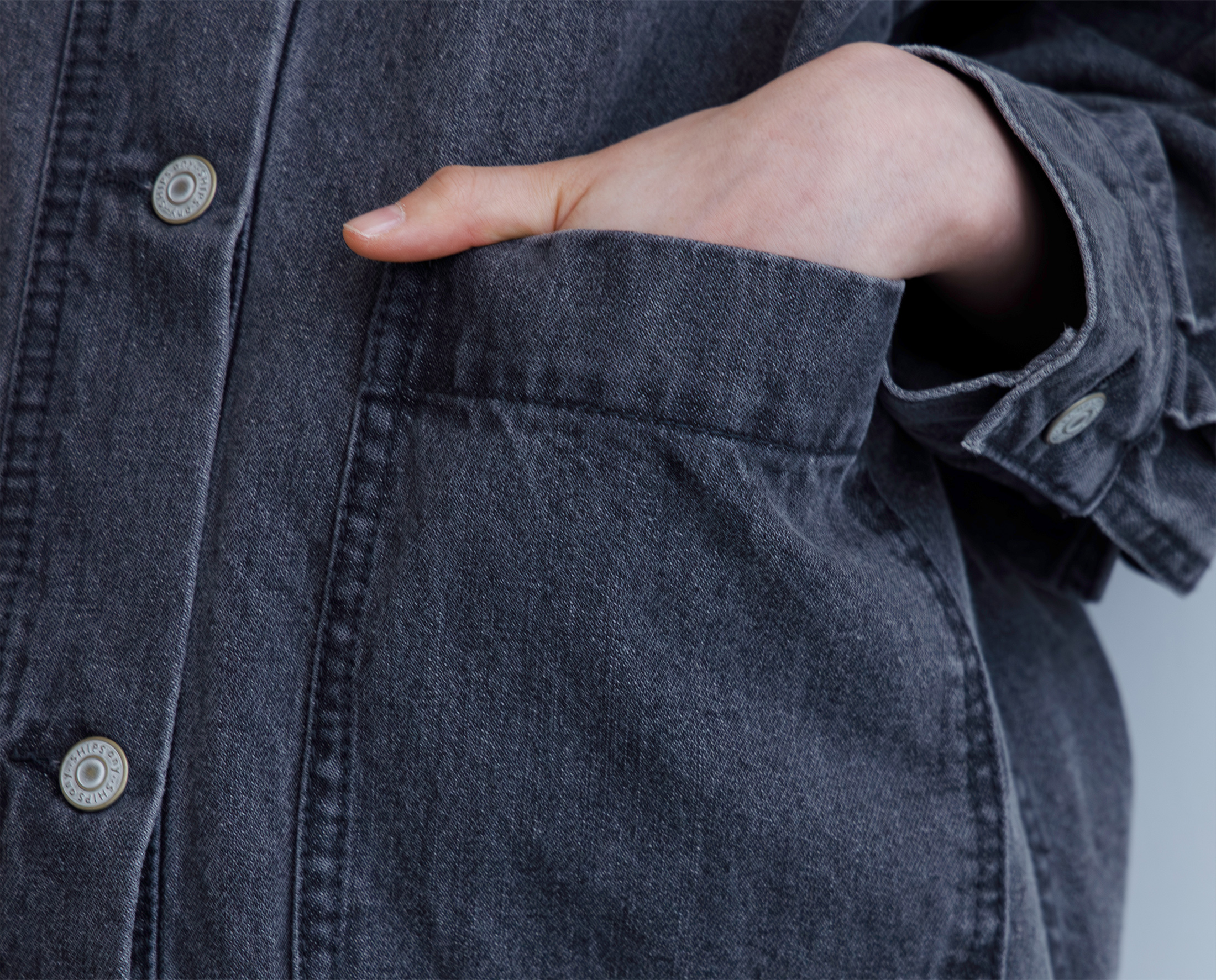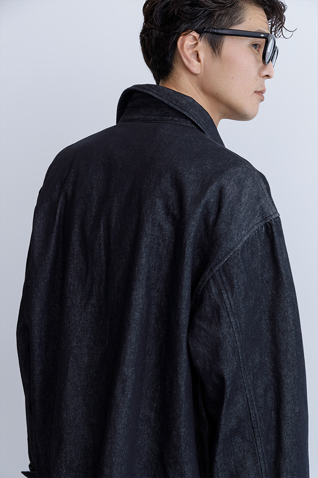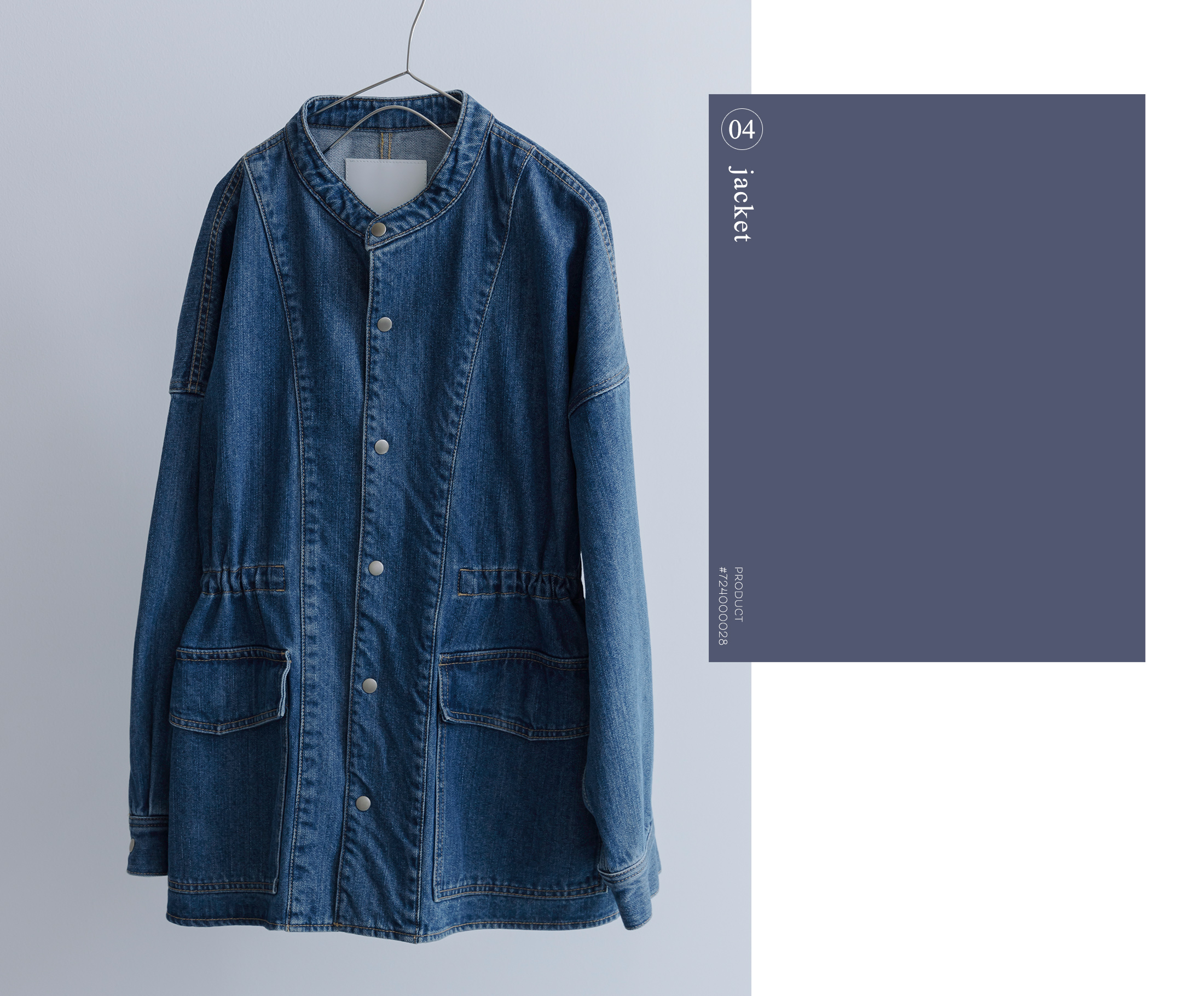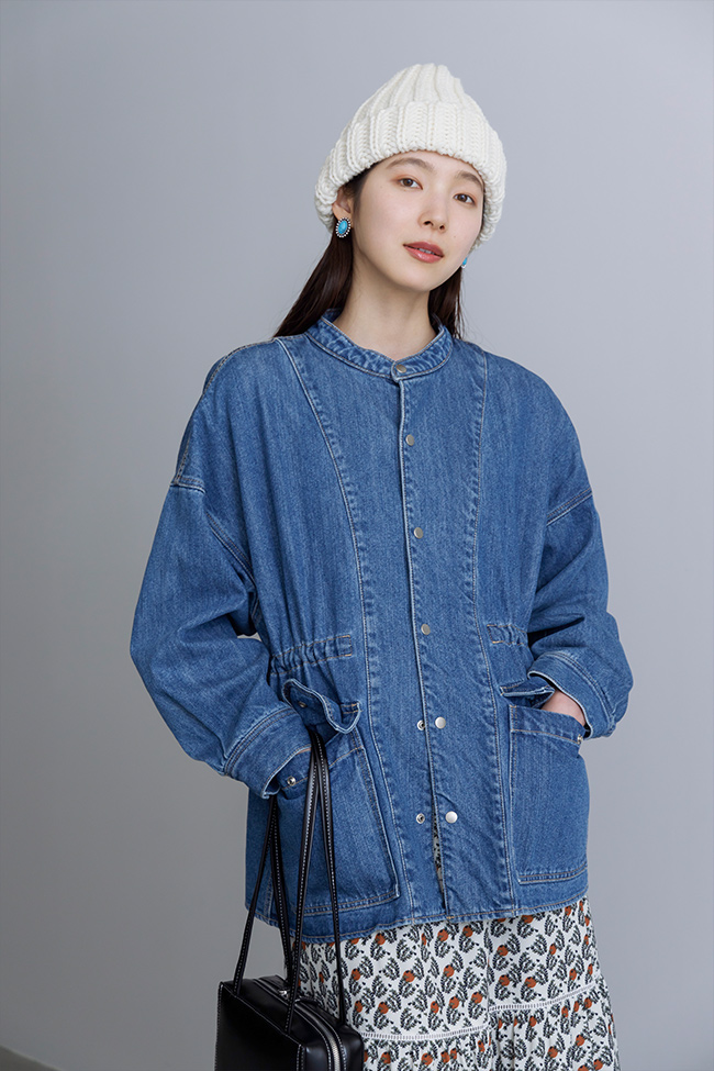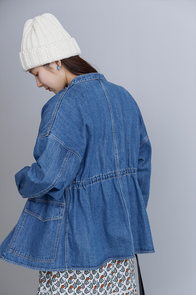 いわゆる"Gジャン"ではないデニムジャケットを1枚は持っておきたいところ。ステッチやフラップポケット、ドローコードで絞れるディテールなどワークテイストをベースとしつつ、ドロップショルダーや小さめのスナップボタンでどこか色気も感じられるデザイン。ボタンを留めてシャツ感覚で着たり、襟を抜いたりとアレンジが効くところも優秀です。