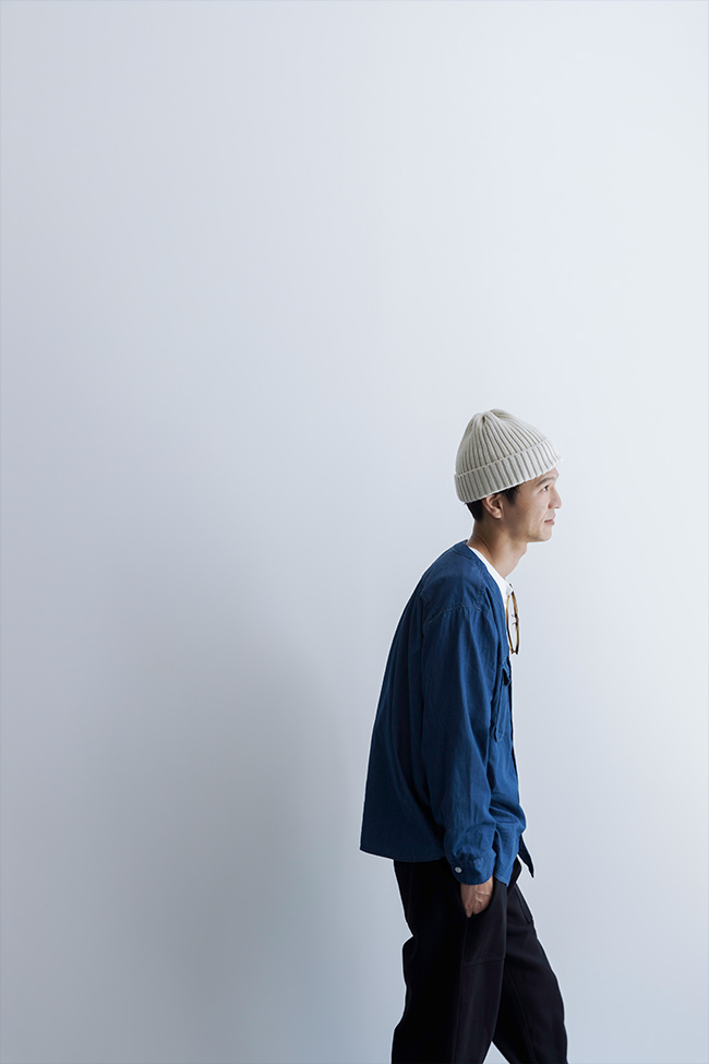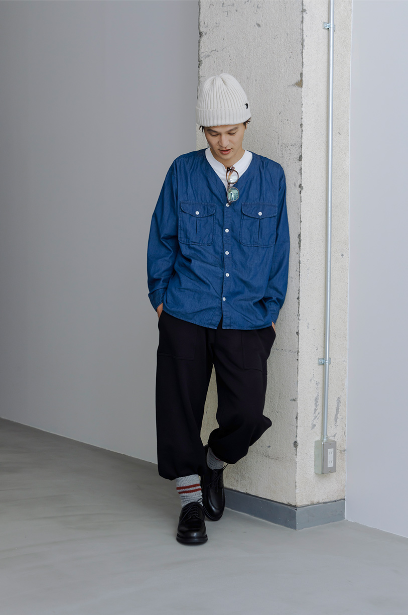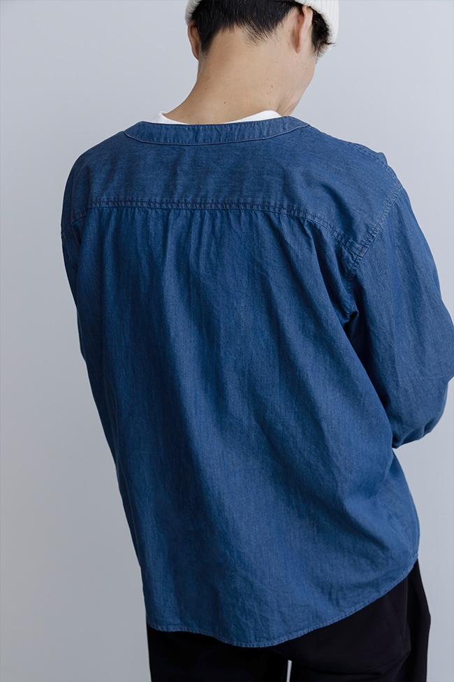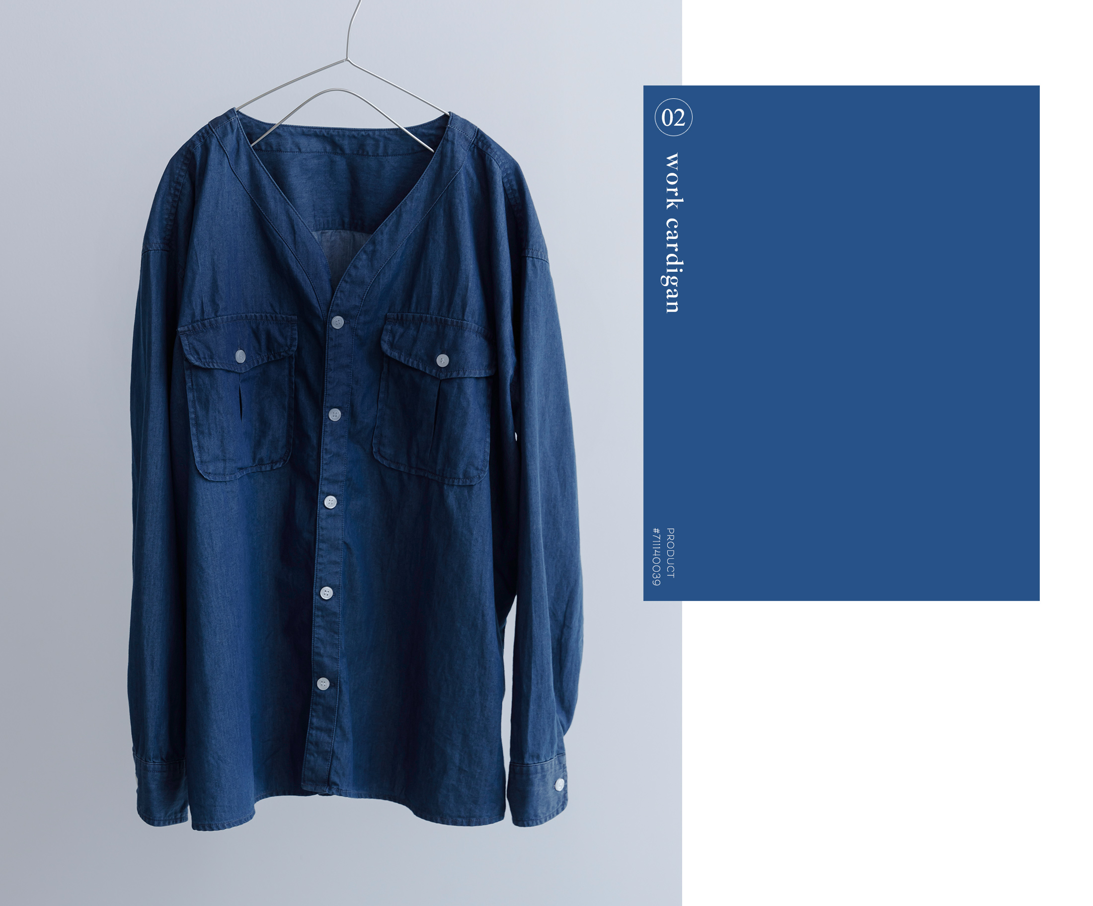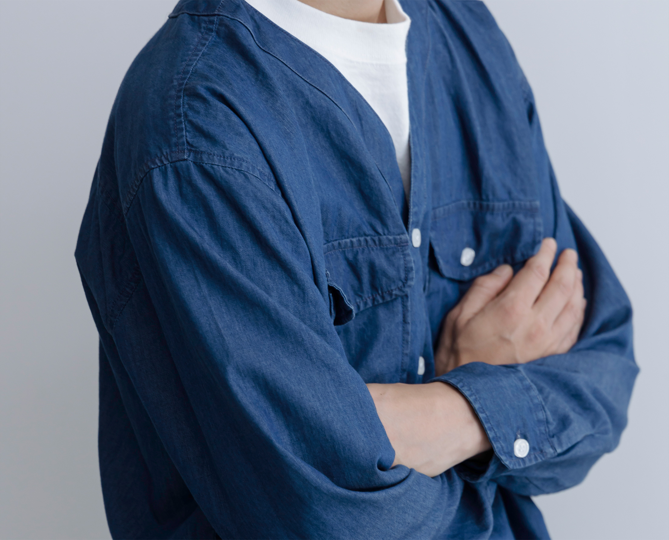 両胸のポケットなどワークテイストのテンションは残しつつ、深く開いたVネックやバックスタイルの横一文字に入ったステッチ使いで自分らしさが演出できる1枚です。インディゴに映える白ボタンが清涼感を与えてくれてグッと好印象に。インにもアウトにも重ねやすい程よいサイズ感と素材なので、夏の終わりから1年中活躍しそうな汎用性の高さもグッド!