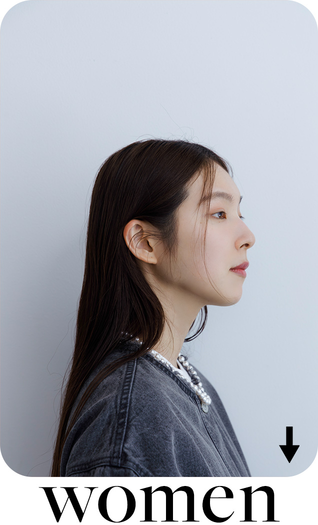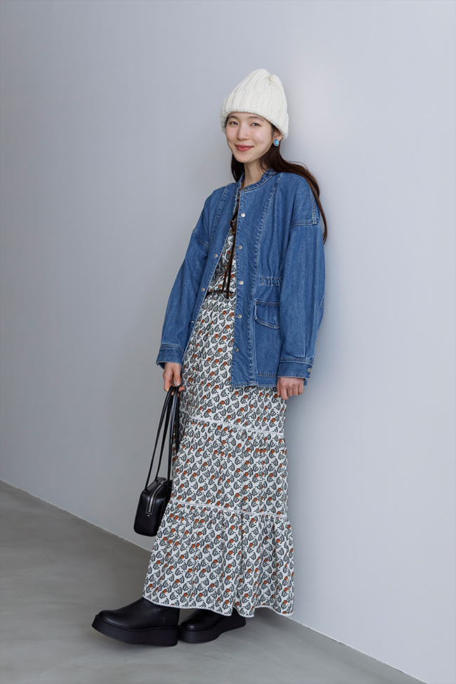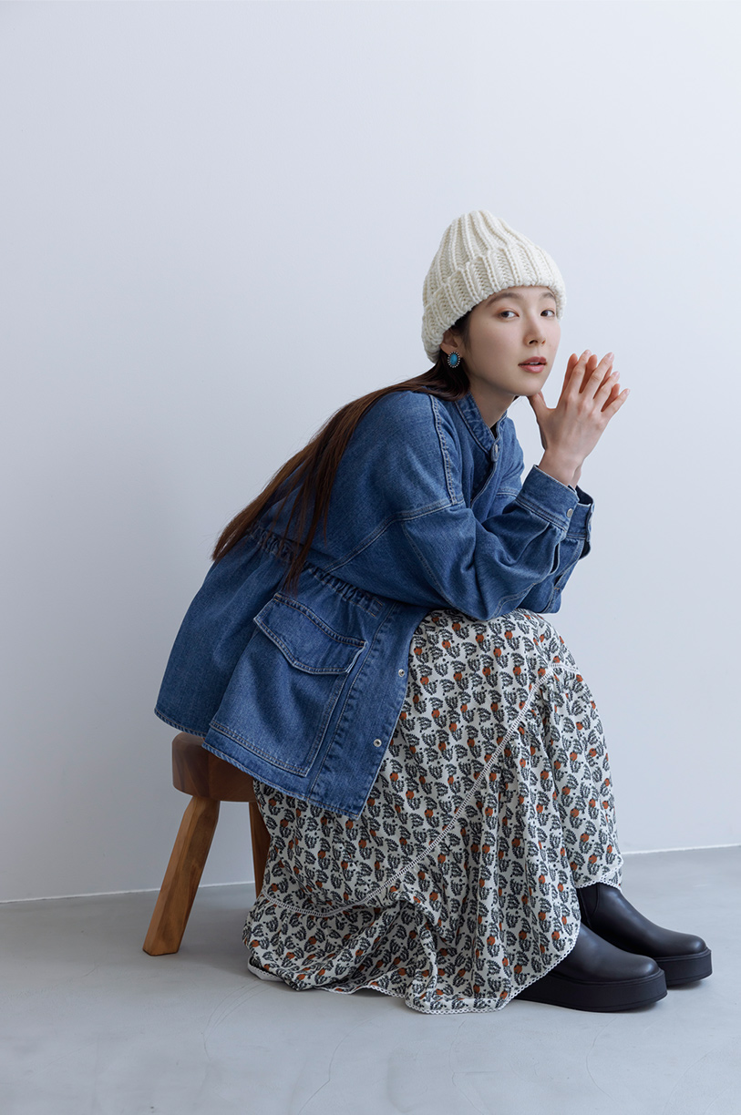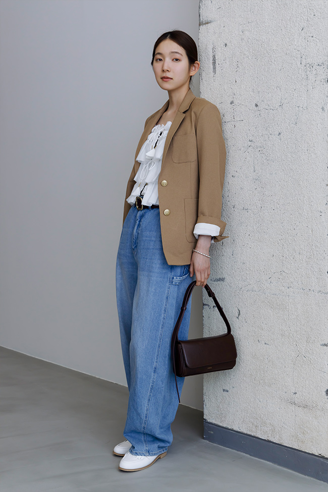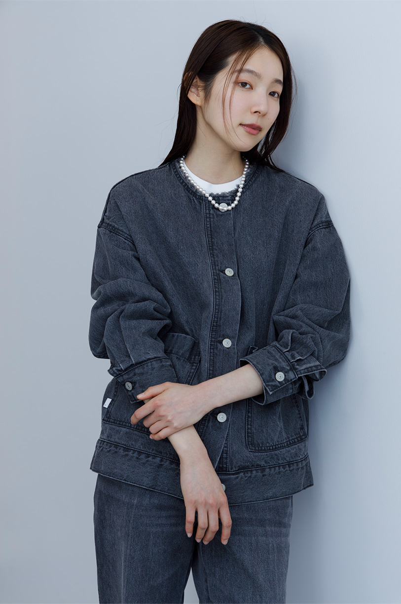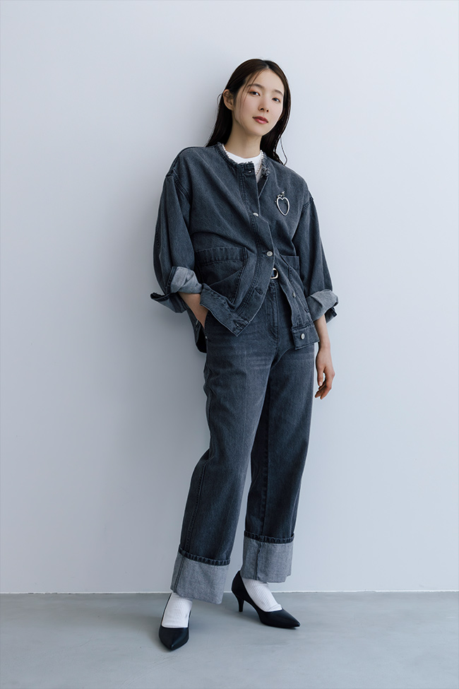 上下デニムで揃えると武骨すぎる!?そんな心配がなくなるのがこちら。ばさっと羽織れるデニムジャケットやロールアップデニムでカジュアル見えするかと思いきや、袖を通すと品よく仕上がるんです。ジャケットはノーカラーで女性らしく、あえて袖をゆるめにすることで腕をまくると華奢さが引き立つデザインに。パンツは腰まわりのスッキリ度を追求しました。