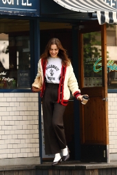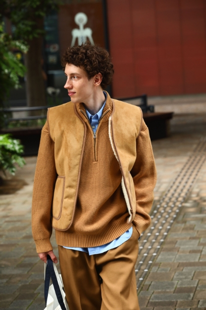 紺色のブレザー、ロゴスウェット、ケーブル編みのセーター。