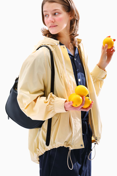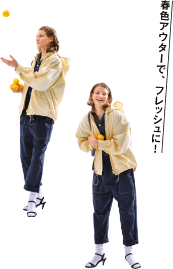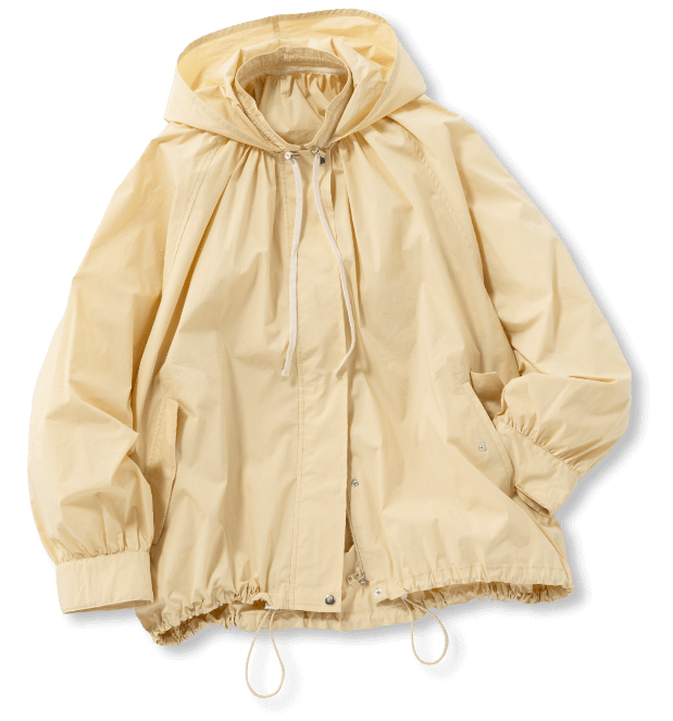 動きやすさと可愛らしさを兼ね備えたマウンテンパーカは、甘酸っぱいレモンのようにフレッシュなカラー。袖口を絞ったり、裾のドローコードを調節すればシルエットの変化も楽しめます。