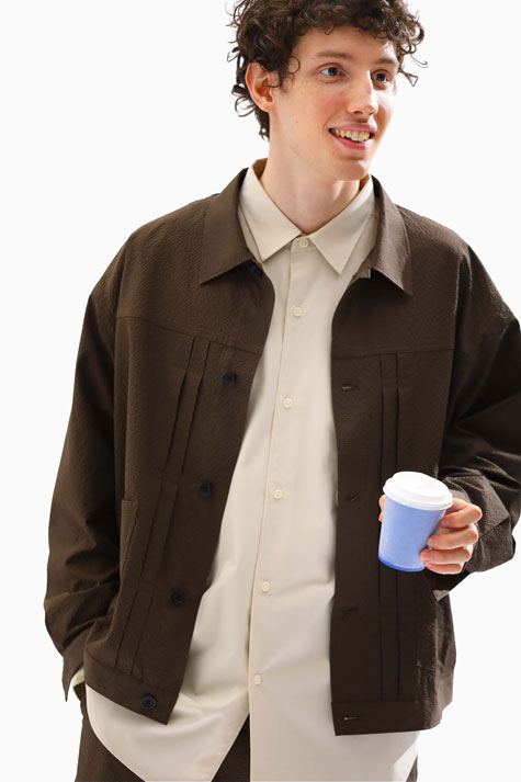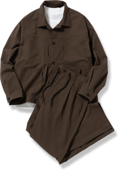 高反発なストレッチ性が期待できるSOLOTEX®生地を用いたシアサッカーのセットアップ。軽やかで涼しい着心地ながら、肘やひざの伸びを気にせずに着用できます。大人っぽい印象のブラウンも新鮮です。