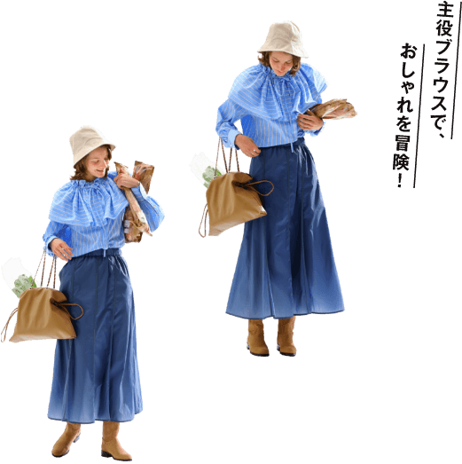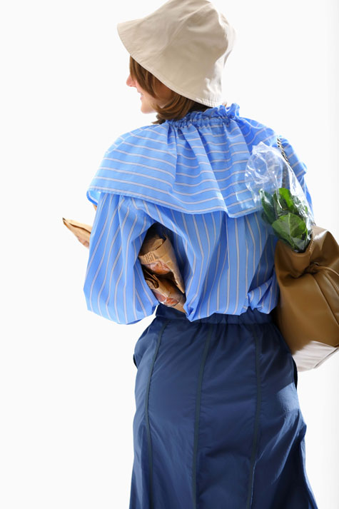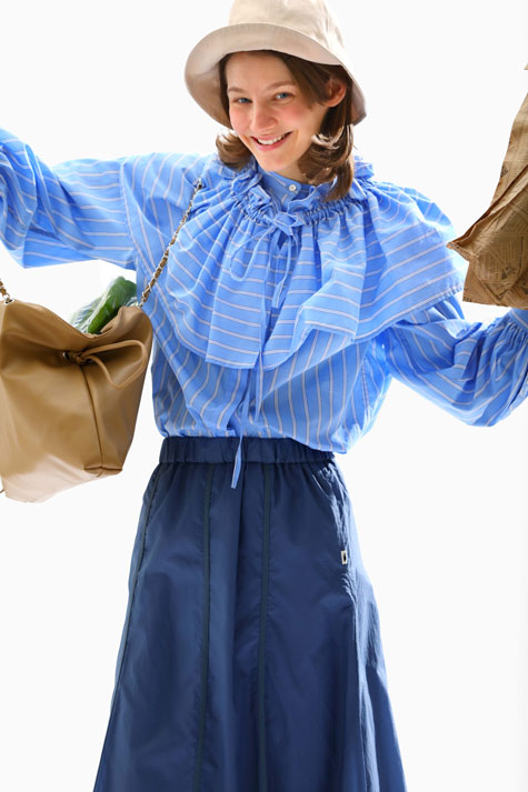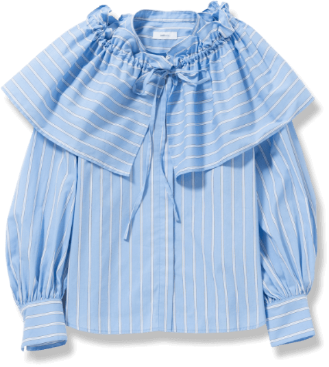 お洒落の充実感を満たしてくれる、爽やかなブラウスの登場です。取り外せるケープ襟はビスチェ風にバスト上で結んだり、ペプラムのようにウエスト部分で結んだりと、何通りものスタイリングが楽しめます。