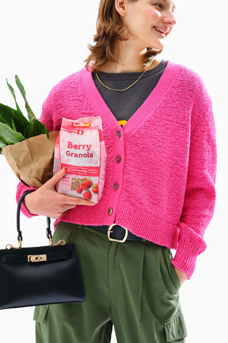 コンパクトな丈感で今年らしさを意識したカーディガン。大人の春スタイルとして気になる主役感のあるピンクは、ボーイッシュなカーゴパンツに合わせることですっと受け入れやすい印象に。
