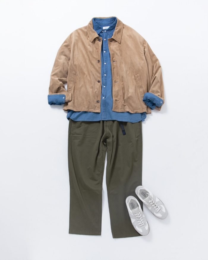 メンズの最新トレンドは、きれいめ×無骨さの「タフロマンティック」。上品なスウェードジャケットに、タフなデニムシャツを仕込んでラフに着崩すのがポイント。足元は白スニーカーでクリーンにハズして、周りと差がつくワンランク上のスタイルに。