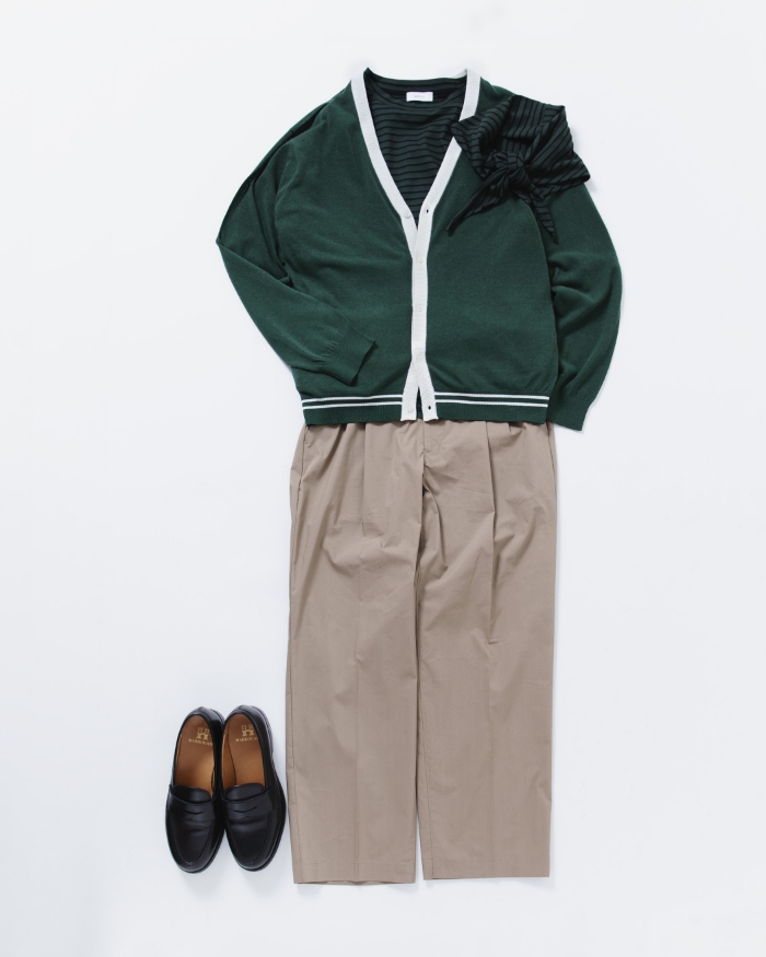 定番のマリンルックを今の気分でアップデートするなら、遊び心のある小物使いから。カーディガンにベージュパンツという王道の品格に、Tシャツとセットのスカーフをプラス。この小さなこだわりで一気に洗練された印象に。