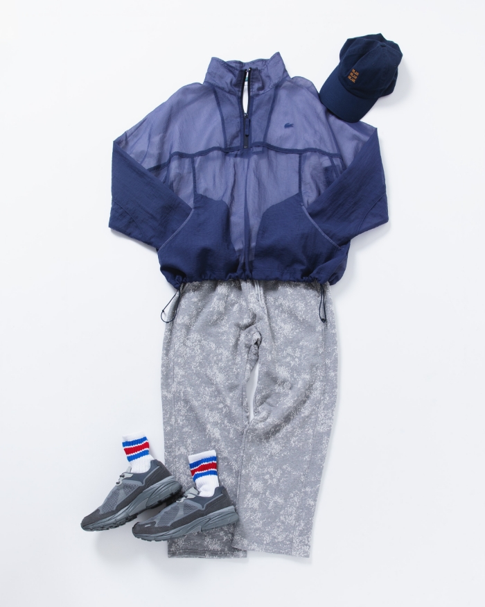 休日のカジュアルスタイルは、品格とアクティブなムードを両立させた「フレンチスポーツ」が新定番。クリーンなTシャツに透け感のあるシアーブルゾンを羽織れば、大人のスポーティールックが完成。足元にはトリコロールカラーのソックスを効かせて、洗練された着こなしへアップデートして。