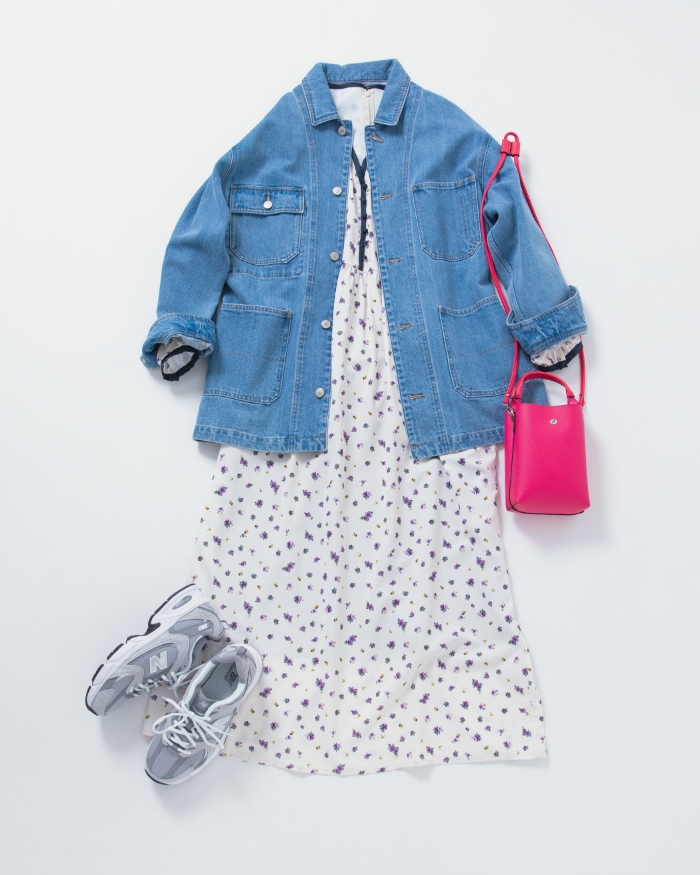 レースや花柄などの「ロマンティック」なムードが今の気分。可憐な小花柄ワンピースはそのまま甘く着るよりも、あえてタフなアイテムでハズすのが今の正解。差し色にトレンドのピンクを投入し、大人のこなれカジュアルにアップデート。