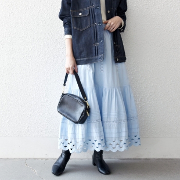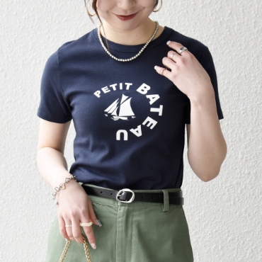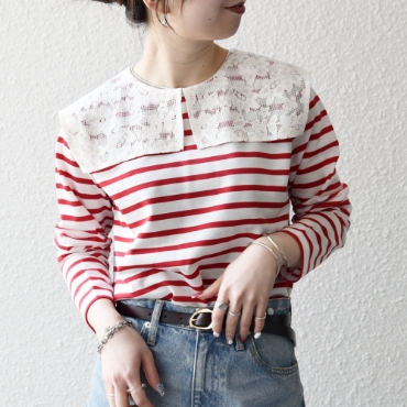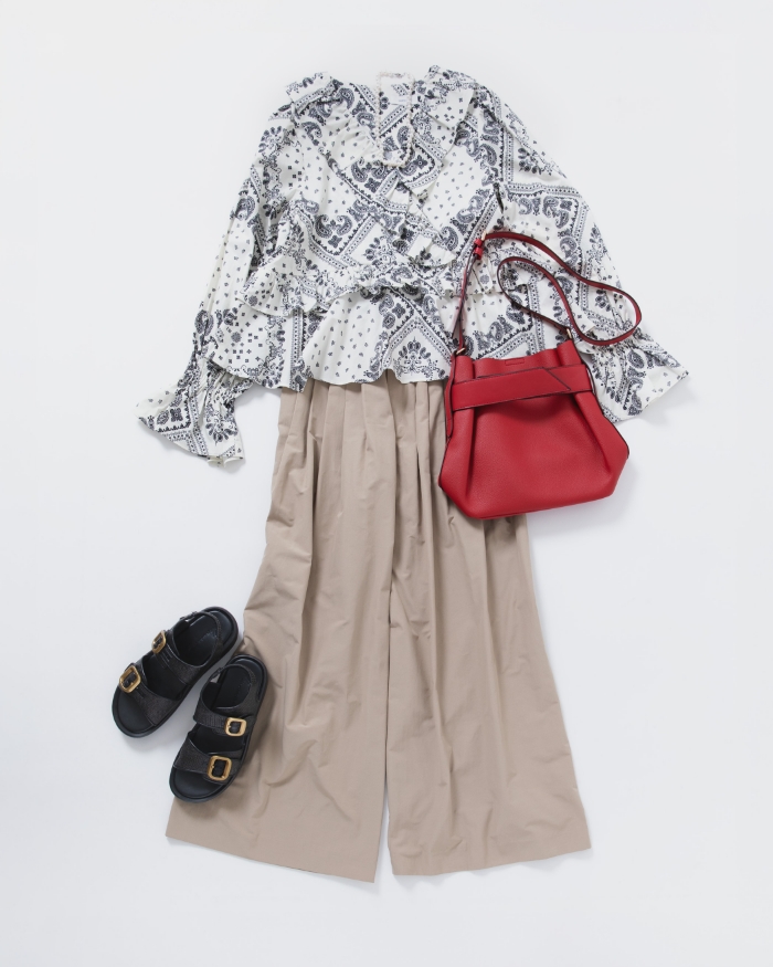 今季はちょっぴりレトロな「リバイバルマリン」に注目。目を惹くフリルブラウスには、リラクシーなベージュパンツを合わせて抜け感をプラス。差し色に赤のバッグを効かせて、どこか懐かしいのに新しい、洗練されたマリンコーデを楽しんで。