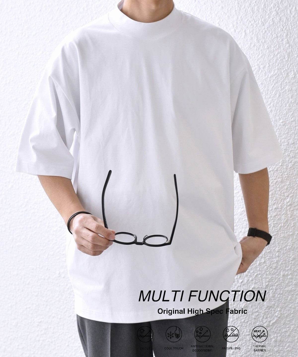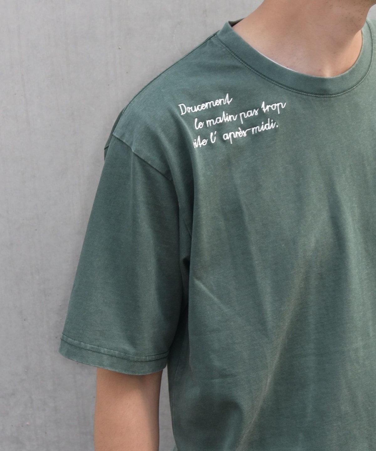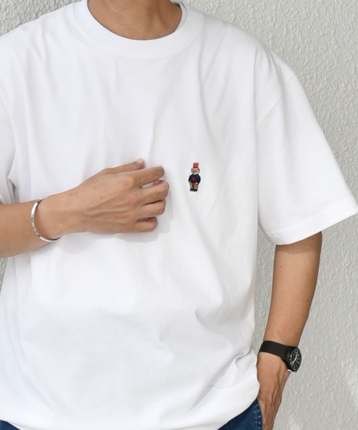 小さく控えめに入ってはいるが、あるのとないのでは大きく違う。ワンポイントがあることで親しみやすさが出てくる。キレイめなスラックスとも相性良く、スマートなTシャツスタイルが叶う。