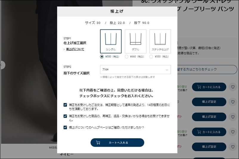 B希望の裾仕上げと裾の縫い幅、股下の長さを選択※商品により選択できる仕上がり、縫い幅、股下は異なります。