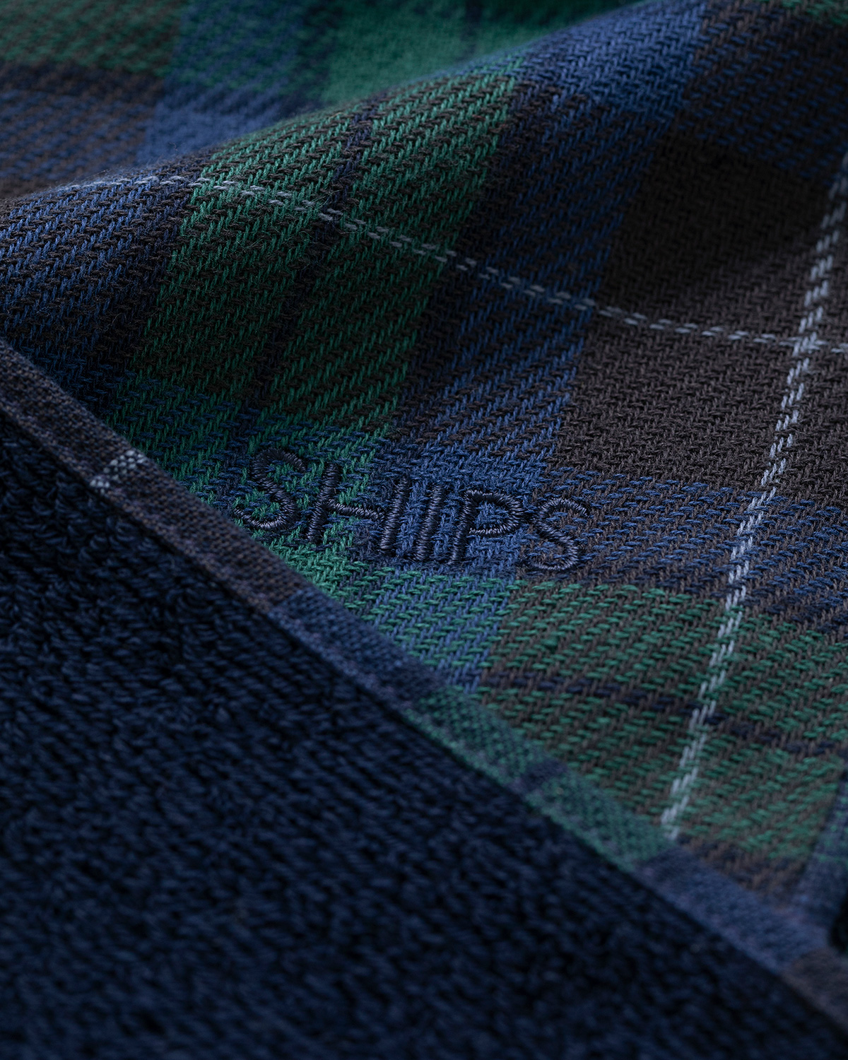 The tartan is truly reflective of the organisation which it represents and is intended to capture the traditions, philosophy and style of this evolving & long-established company. The design incorporates shades found in nature along with the ivy green, the brand colour of SHIPS predecessor store, Miura & Sons. SHIPS corporate colour is navy blue, the colour of the sea.