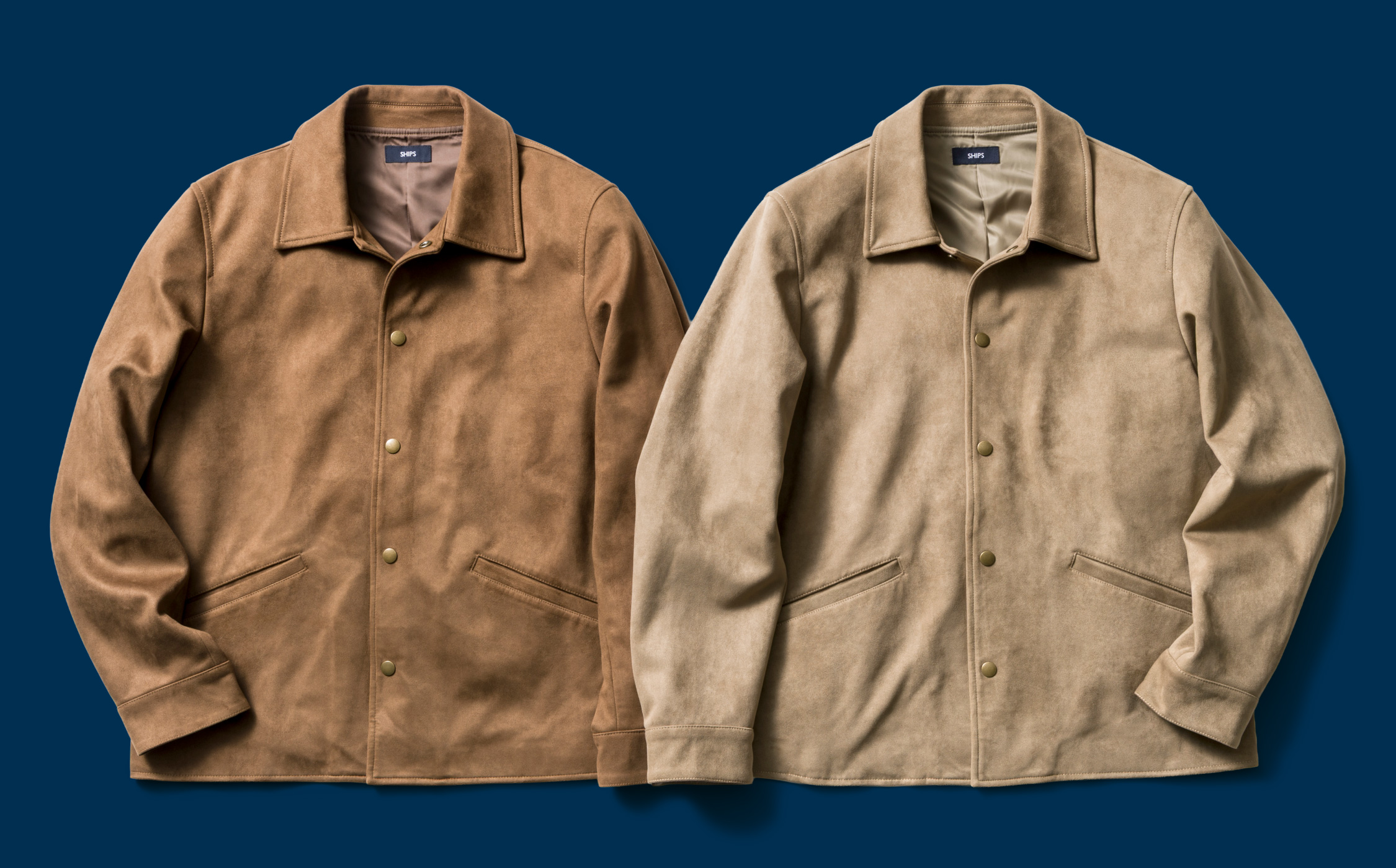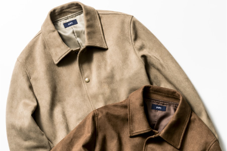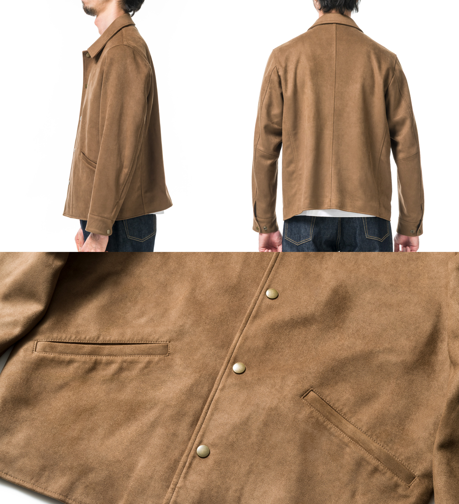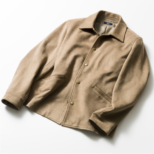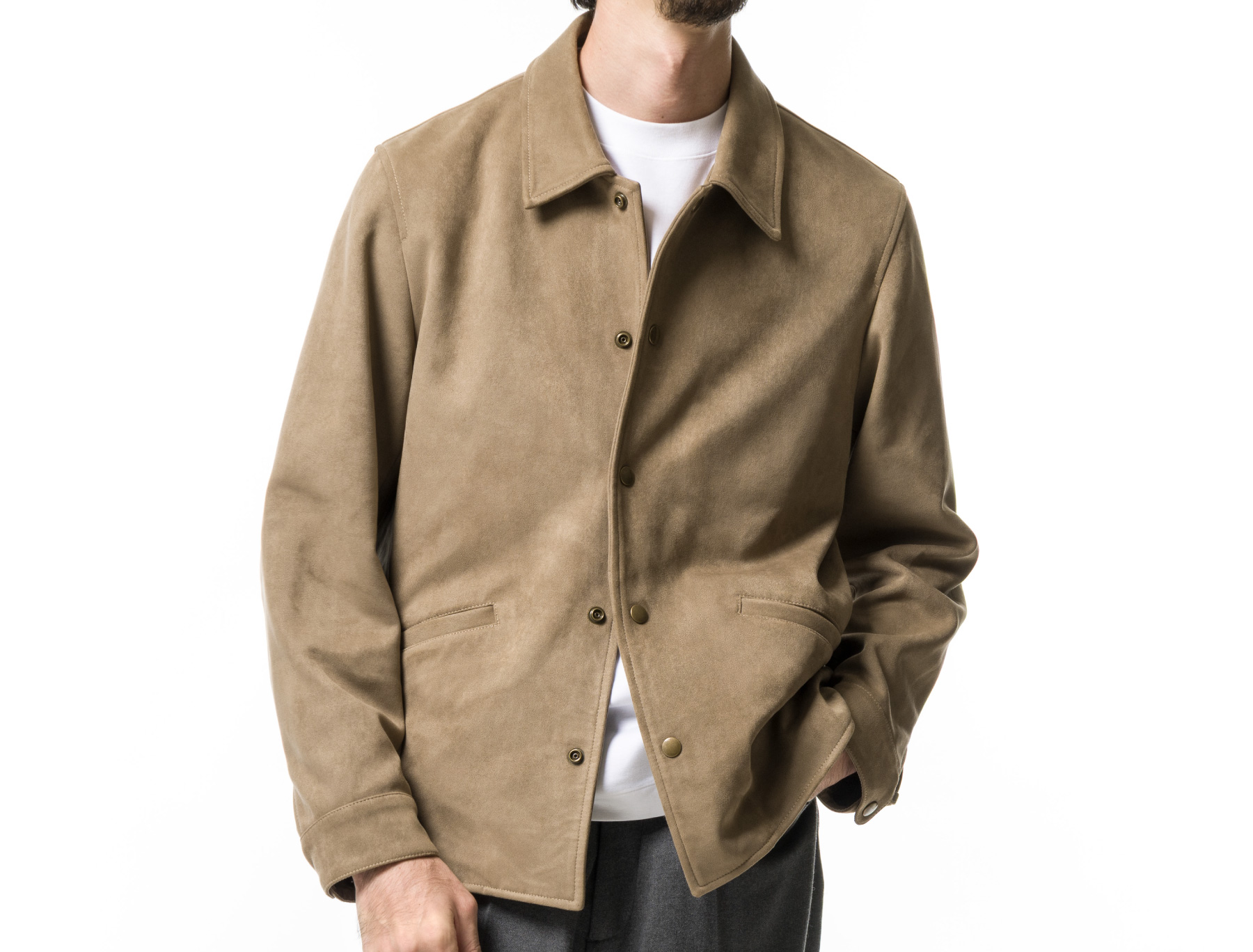 まるでホンモノ!?な毛並みのポリエステルスエードを用い、ライダース×コーチジャケットのハイブリッドのようなデザインにした本作は、そんな男心に響く“オーラ”を備えながら、よりフランクかつ大人っぽく着こなせる新鮮なジャケット。白Tの上にテキトーに羽織るだけでもご覧のとおり、サマになってしまうのです!!