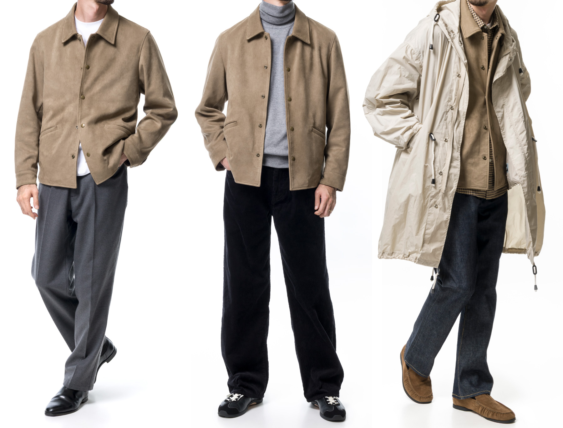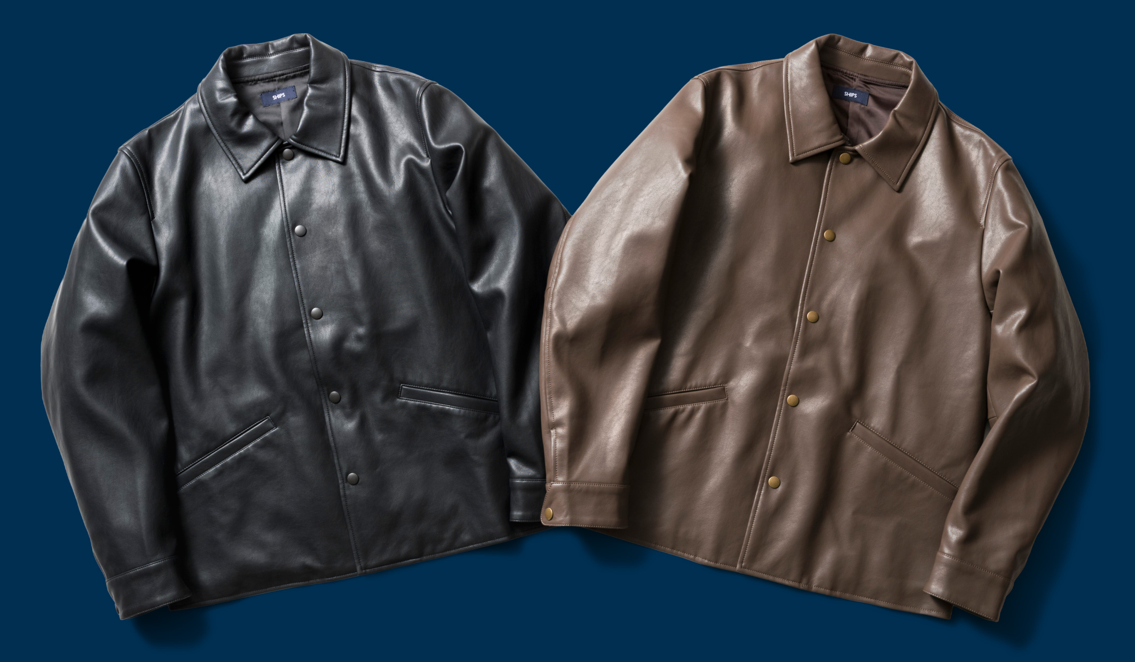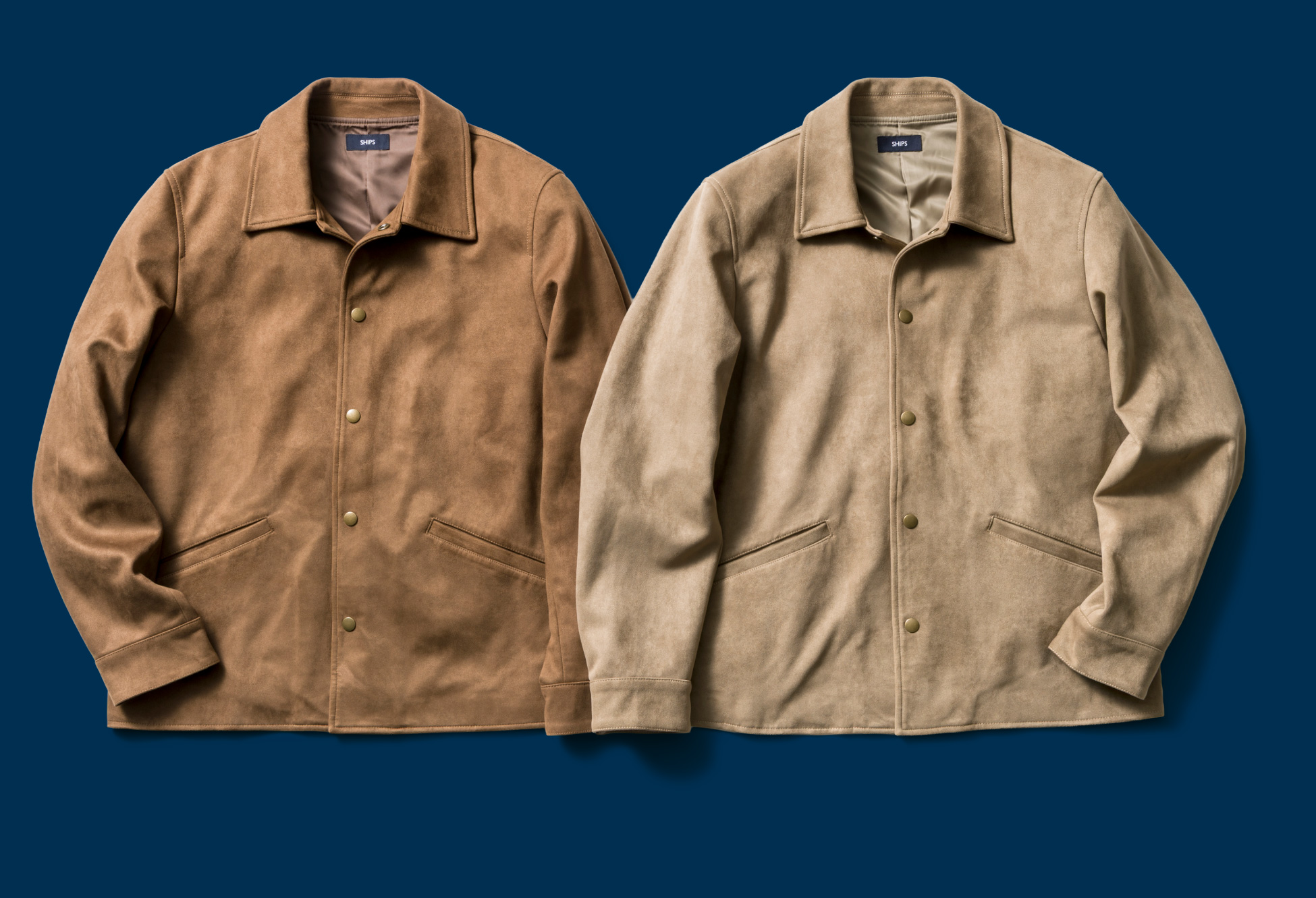 まるでホンモノ!?な毛並みのポリエステルスエードを用い、ライダース×コーチジャケットのハイブリッドのようなデザインにした本作は、そんな男心に響く“オーラ”を備えながら、よりフランクかつ大人っぽく着こなせる新鮮なジャケット。白Tの上にテキトーに羽織るだけでもご覧のとおり、サマになってしまうのです!!