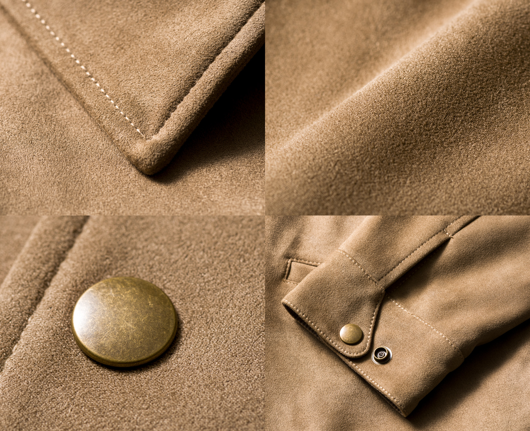 左上/野生味のある素材でありながら大人っぽく見える背景には、作りの丁寧さがあり。乱れのないステッチや運針の細かさに、それが現れています。右上/リアルな起毛感のポリエステルスエード。本物のそれに比べ、匂いが気にならず、お手入れが簡単なのも魅力です。左下/フロントはコーチジャケット風のスナップボタン留め。ボタンにはプレーンなそれではなくヴィンテージ調の真鍮ボタンが用いられていて、これが素材の野生味にマッチ。パーツの選定一つにも抜かりありません! 右下/袖口はスナップボタンによる2段階のアジャスタブル仕様。オフセットさせたデザインが、袖口にワンポイントを添えています。