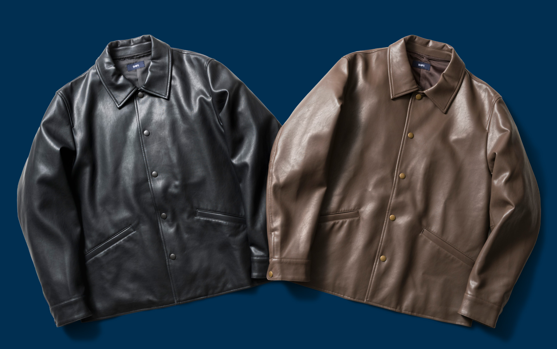ナチュラルなシボが並ぶ、表革風のポリエステルレザーを用いたモデルもあり。よりライダースに近いハードボイルドなテイストがお好みなら、こちらがオススメです。とはいえ程よいゆとりがあるボックスシルエット&フランクなデザインは、着る人を選ばず。気負わず着られるのも、ならではの魅力といえるでしょう。