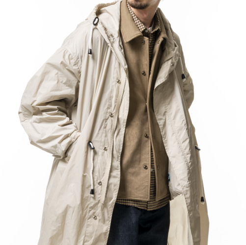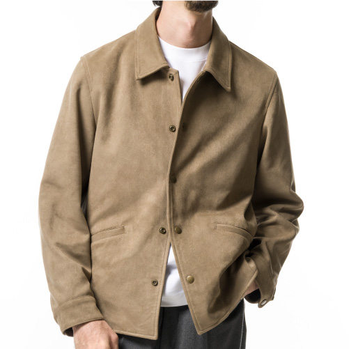 ポリエステルの基布にポリウレタン樹脂を塗布した、ポリエステルスエード製のジャケット。ライダースとコーチジャケットの中間を行くそのデザインは、無骨でありながらもフランクな趣。程よいゆとりを設けたボックスシルエットとしなやかなタッチが相まって、袖を通したそのときから快適に着られるのも魅力です。