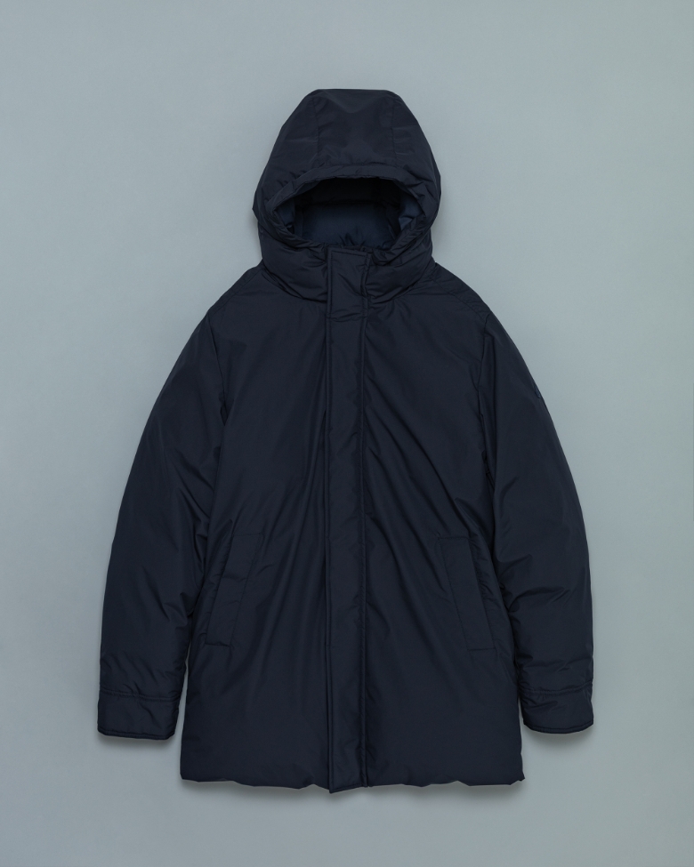 1859年創業、フランスを代表するダウンブランド〈PYRENEX〉。ピレネー山脈の麓で培われた羽毛精製の技術を背景に、高品質なダウンを作り続けている。オンオフ兼用モデル「PAU」は、比翼仕立てのフロントにキルトステッチを省いたミニマルな表情が特徴。立体的な設計のボリュームフードは、スーツの上にも難なく馴染む。軽量なリップストップ生地と800フィルパワーのダウンが生む、抜群の軽さと保温性。左袖のワントーンロゴが上品に映える、大人のためのハイクオリティ・ダウン。