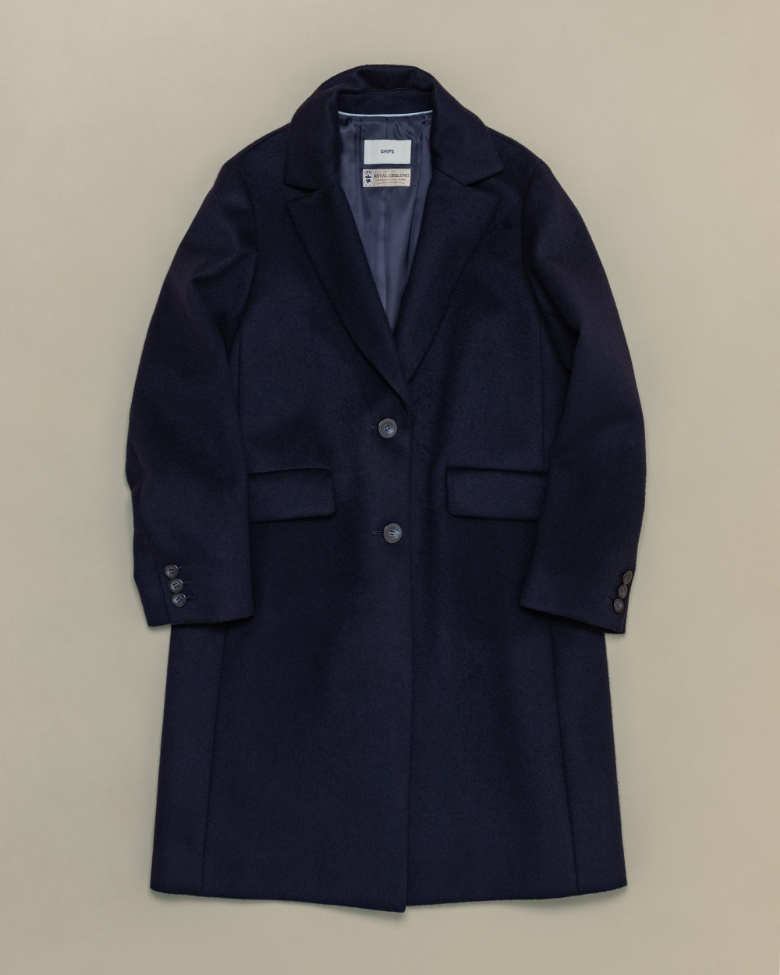 ロイヤルジーロンのビーバーメルトンを用いたチェスターコートは、端正なネイビーを女性らしく纏える一着。オーストラリア・ジーロン地方で産出される羊毛の中でも特に繊維が細く、白度に優れ、カシミヤのような柔らかさと光沢を持つ高級素材。スーパー140’sクラスのファインウールをブレンドし、丁寧な起毛加工で温かみのあるしなやかな風合いに仕上げている。素材の持つ上質感が、シルエットに穏やかな気品を添える。