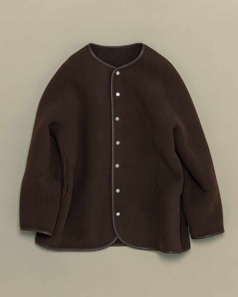 ボアとフリースのボンディング素材を用いたリバーシブルブルゾンは、ボアのやわらかな膨らみとフリースのなめらかさ、二つの質感を一着に閉じ込めた冬の頼れる相棒。両脇と袖下にマチを設け、立体感を出すことで、横に広がらず縦長の美しいシルエットを実現。メタルボタンのきらめきが、カーディガン感覚のやさしさに凛とした表情を宿す。軽やかさと温もりが、両A面の楽しさとともに、冬の装いを洗練で満たしてくれる。