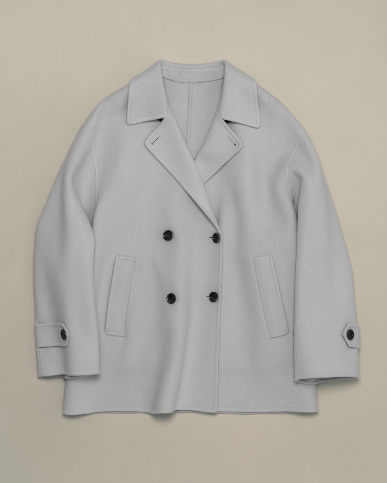 リバー仕立てのダブルフェイスPコートは、女性らしい柔らかでしなやかな表情を演出する、スーパー140’s原料のパイルメルトンを使用。肩幅や袖のパターンに工夫を凝らし、ゆったりしたサイズ感でも肩まわりをすっきり見せるスマートなシルエットを実現。身頃は裏地なしで軽やかに、袖には裏地を配して着脱時の袖通りも滑らか。襟は2WAY仕様で、一番上まで留めればまた別の表情を楽しめる。日常の装いに上質な軽やかさと洗練を添える一着。